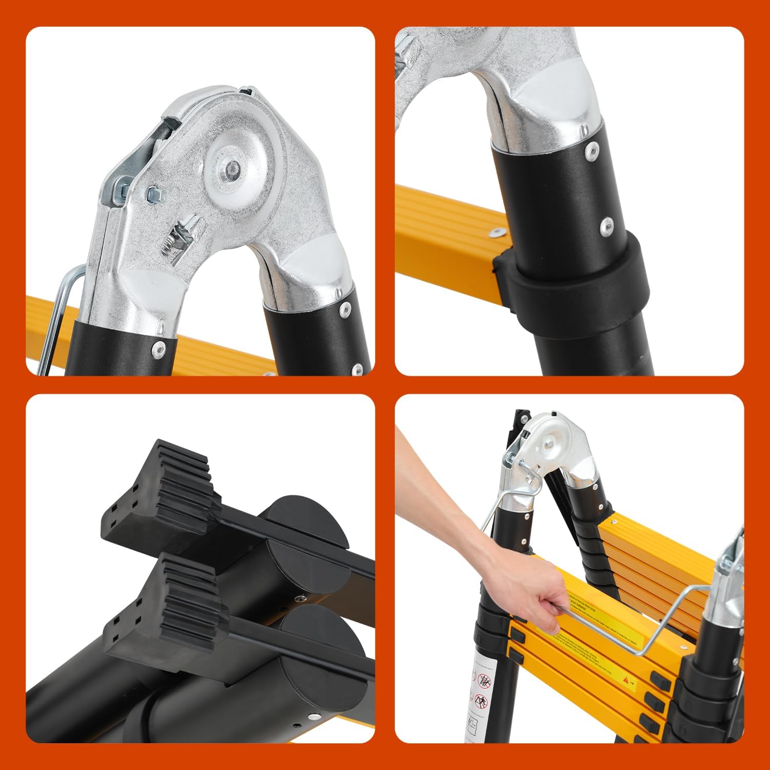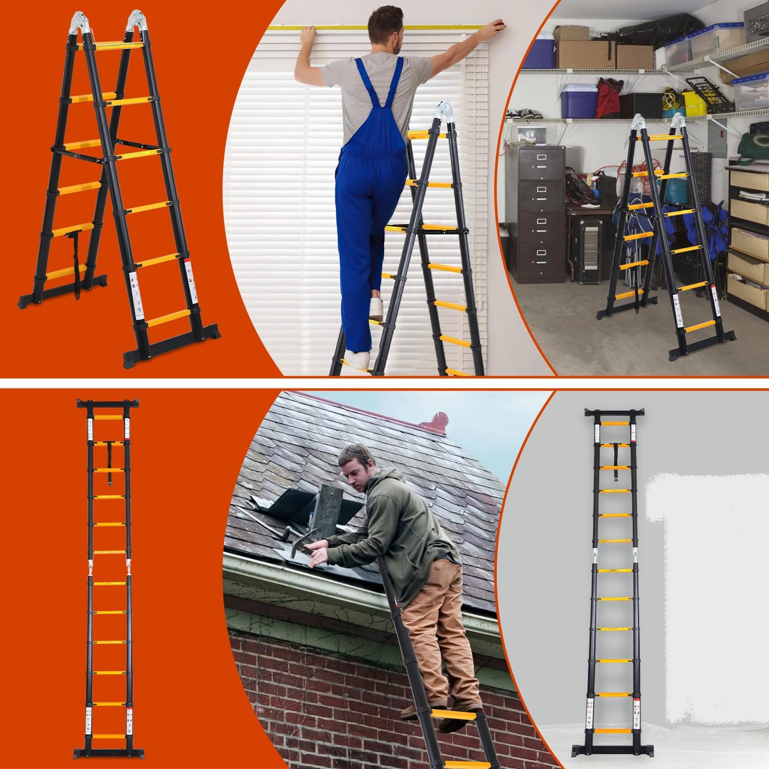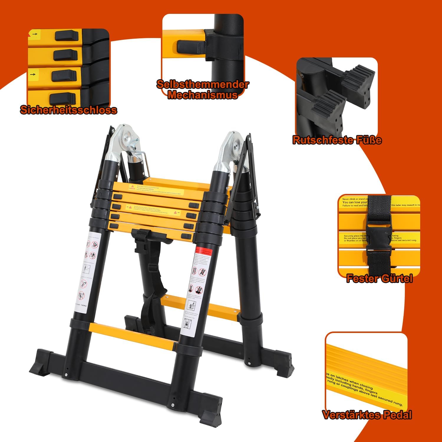 - ⭐Aufgerüstete Teleskopleitern: Die Leiter nimmt ein Klappdesign mit einer,Gefaltete Höhe: 88cm, Entfaltete Höhe: 3.8(1.9+1.9)cm, und insgesamt 6+6 Stufen an. Nettogewicht : 13kg, Farbe: Schwarz Gelb.Maximale Belastung bis zu 150 kg. Mit dreieckigen