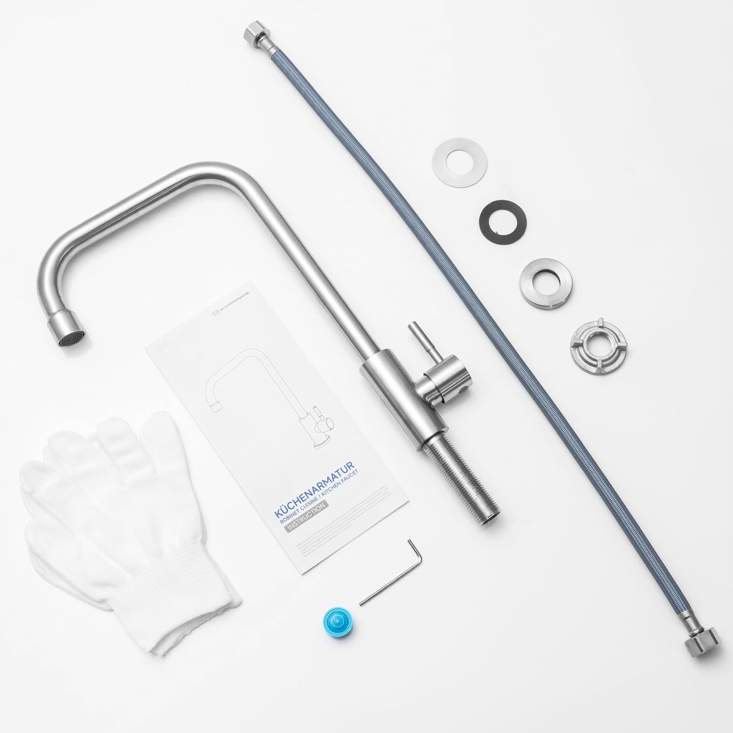 - 360° Drehbar: Der 7-förmige Wasserauslaufkrümmer kann flexibel um 360° gedreht werden, um den Reinigungsbedarf in verschiedenen Richtungen zu erfüllen, geeignet für Küchenspülen, Wohnmobilräume oder kleine Waschbecken.