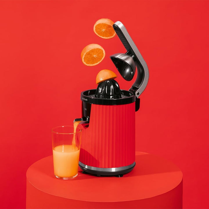 - Elektrischer Entsafter für Orangen und Zitrusfrüchte mit 600 W Leistung, Edelstahlfilter, Kunststoffkegel, Hebel zum Entnehmen des Fruchtfleisches und Tropfschutz.