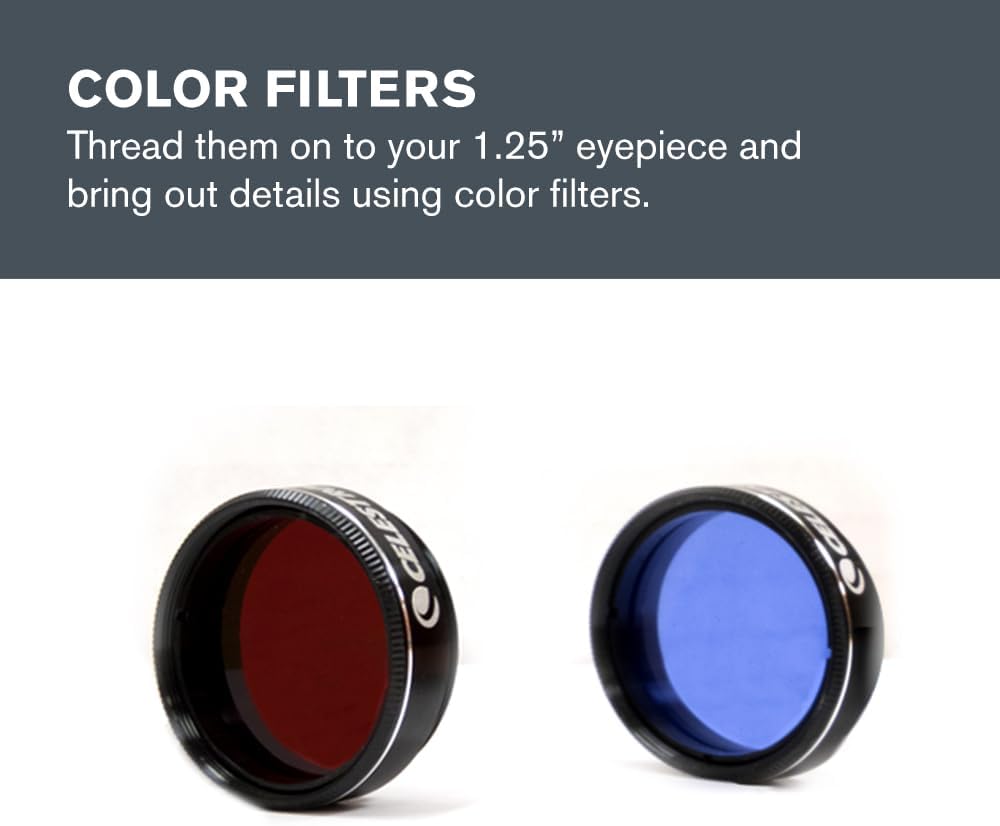 - MIT MONDFILTER: Mit dem Mondfilter können Sie das helle Mondlicht ausfiltern, damit Sie ihn komfortabler und in grösserem Detail betrachten können. Die beiden Farbfilter (rot und blau) heben die Merkmale auf Mars, Jupiter und Saturn hervor.