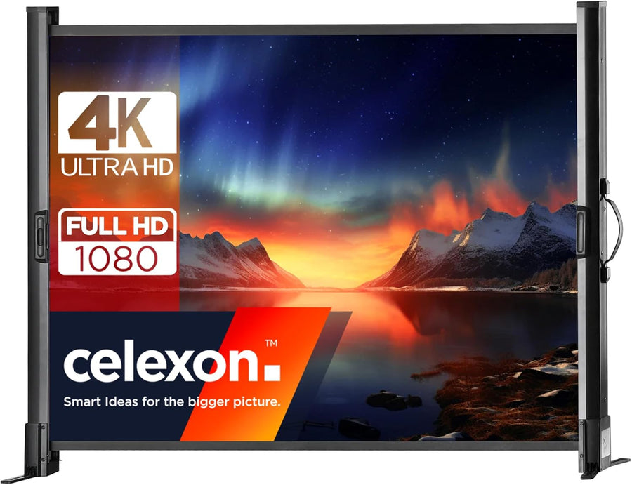 - celexon Pro Tischleinwand - sichtbare Projektionsfläche: 102x76 - schwarzer Rand: 2 cm - Gehäuseabmessungen: 84x9x4,5 cm - Gewicht: 3,5kg (netto)