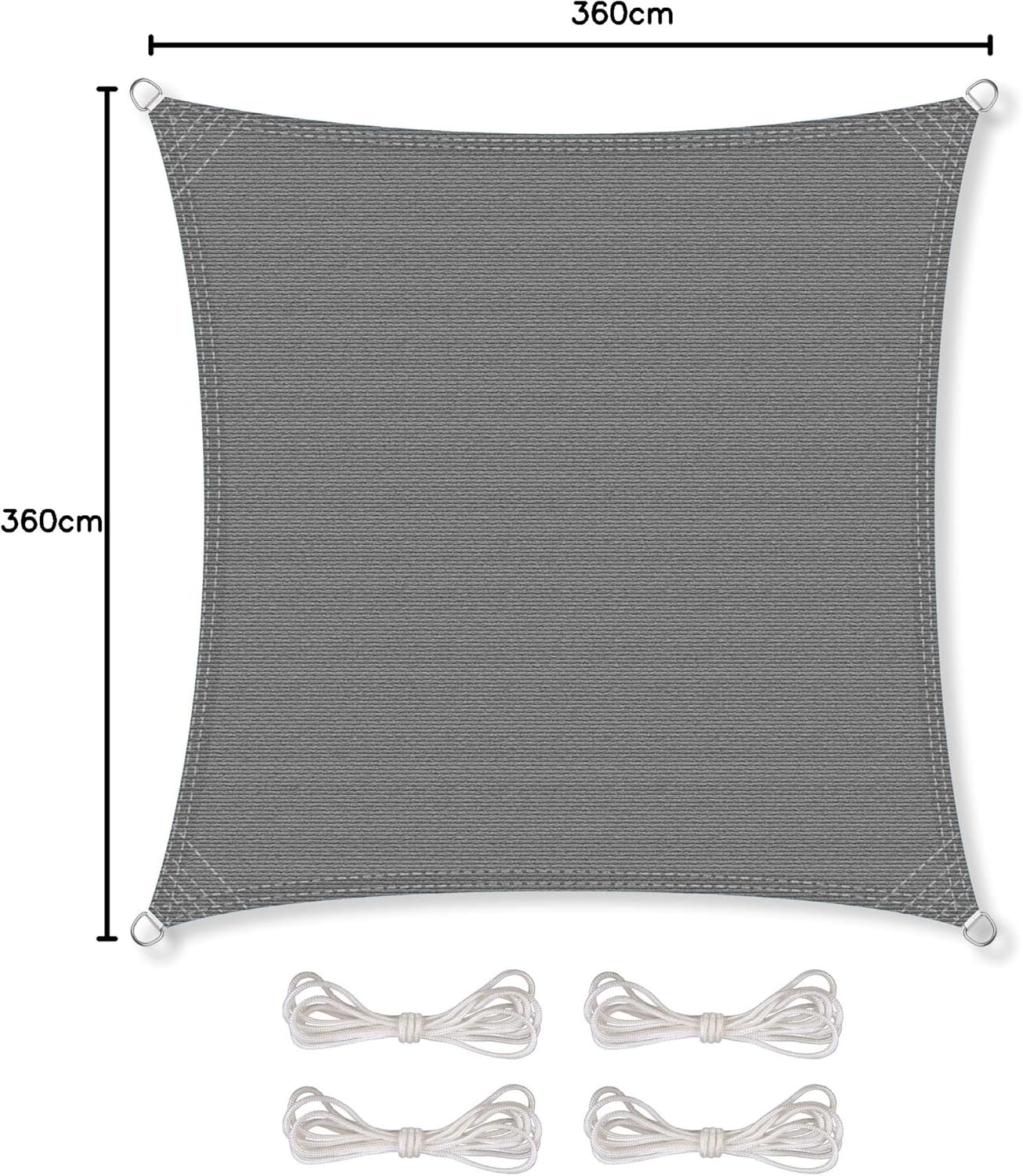 - das Segel Set besteht aus: 1x Sonnensegel wind- und wasserdurchlässig (HDPE), Farbe: anthrazit, quadratisch 3,6x3,6m, 4x Befestigungsseile (je ca. 1,5m), reissfestes High Density Polyethylen Gewebe (HDPE), sorgt für ca 85% Abschattung, Gewicht von ca