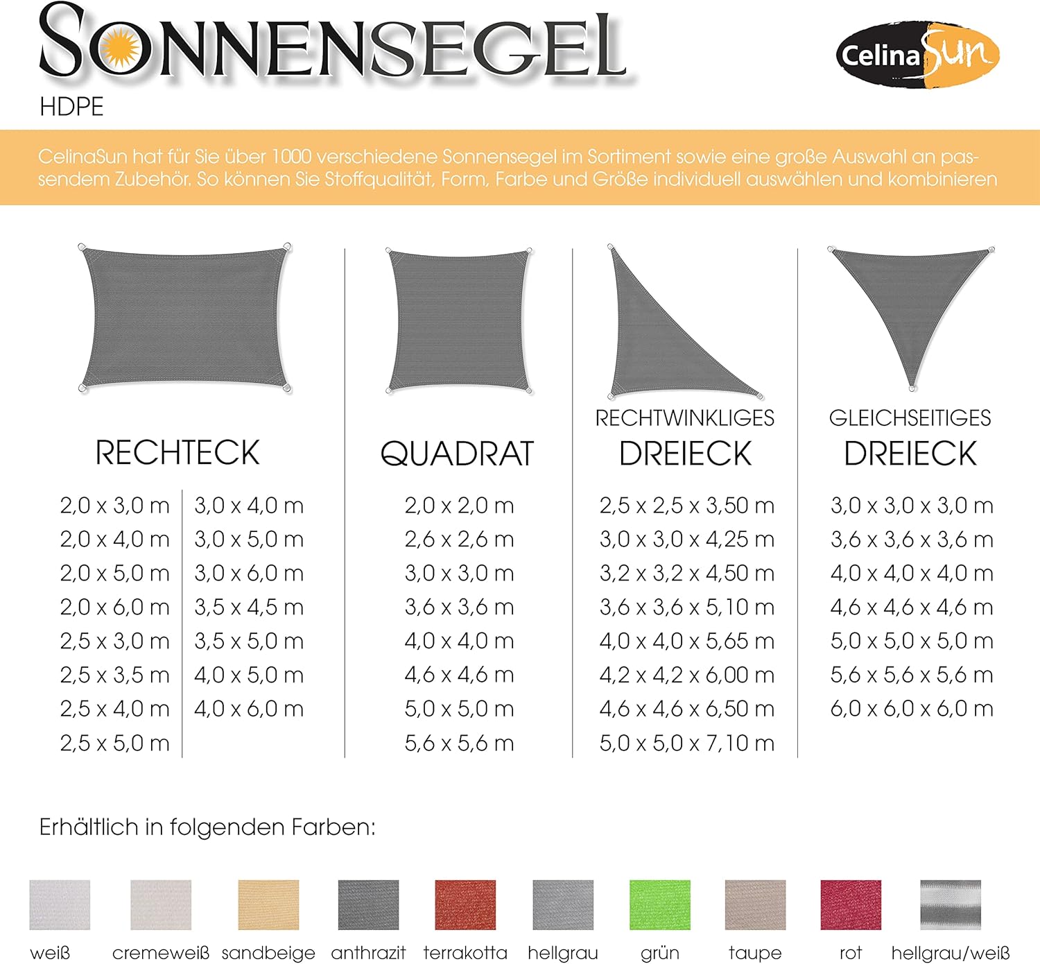 - CelinaSun Premium HDPE Sonnenschutz wasserdurchlässig und robust, klimaregulierender Netzstruktur, einfache und schnelle Montage. Zur Befestigung sind an den Ecken Edelstahlösen angebracht, diese wurden extra 5-fach quer vernäht um eine erstklassige