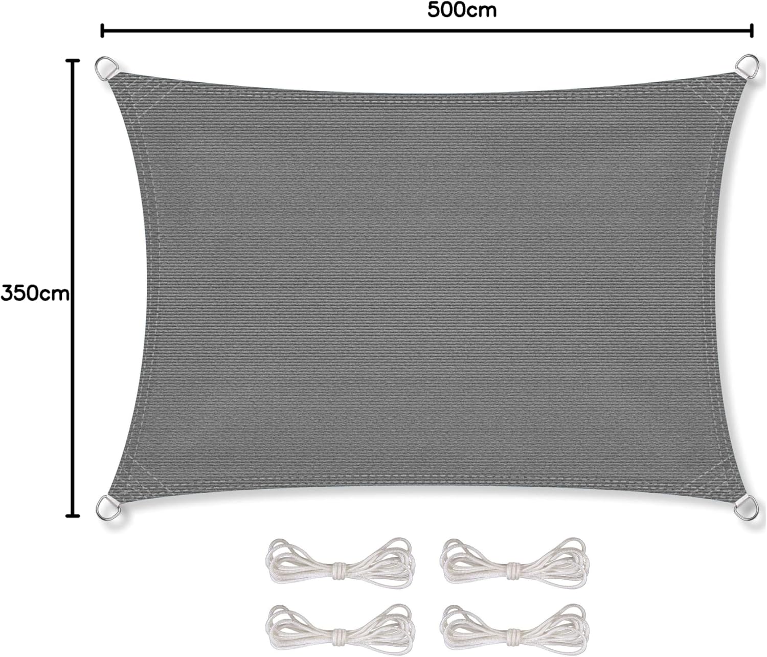 - das Segel Set besteht aus: 1x Sonnensegel wind- und wasserdurchlässig (HDPE), Farbe: anthrazit, rechteckig 3,5x5m, 4x Befestigungsseile (je ca. 1,5m), reissfestes High Density Polyethylen Gewebe (HDPE), sorgt für ca 85% Abschattung, Gewicht von ca