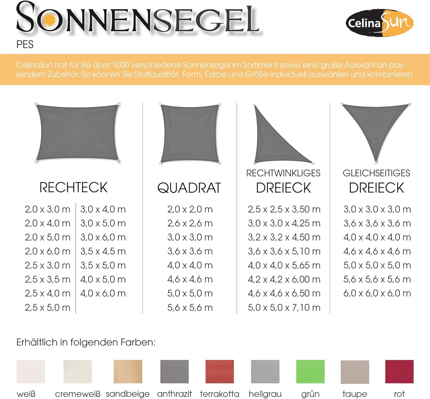 - CelinaSun Premium PES Sonnensegel / Sonnenschutz wasserabweisend. Das robuste Segel lässt sich einfach und schnell montieren. Zur Befestigung sind an den Ecken Edelstahlösen angebracht, diese wurden für eine hervorragende Stabilität extra 5-fach quer