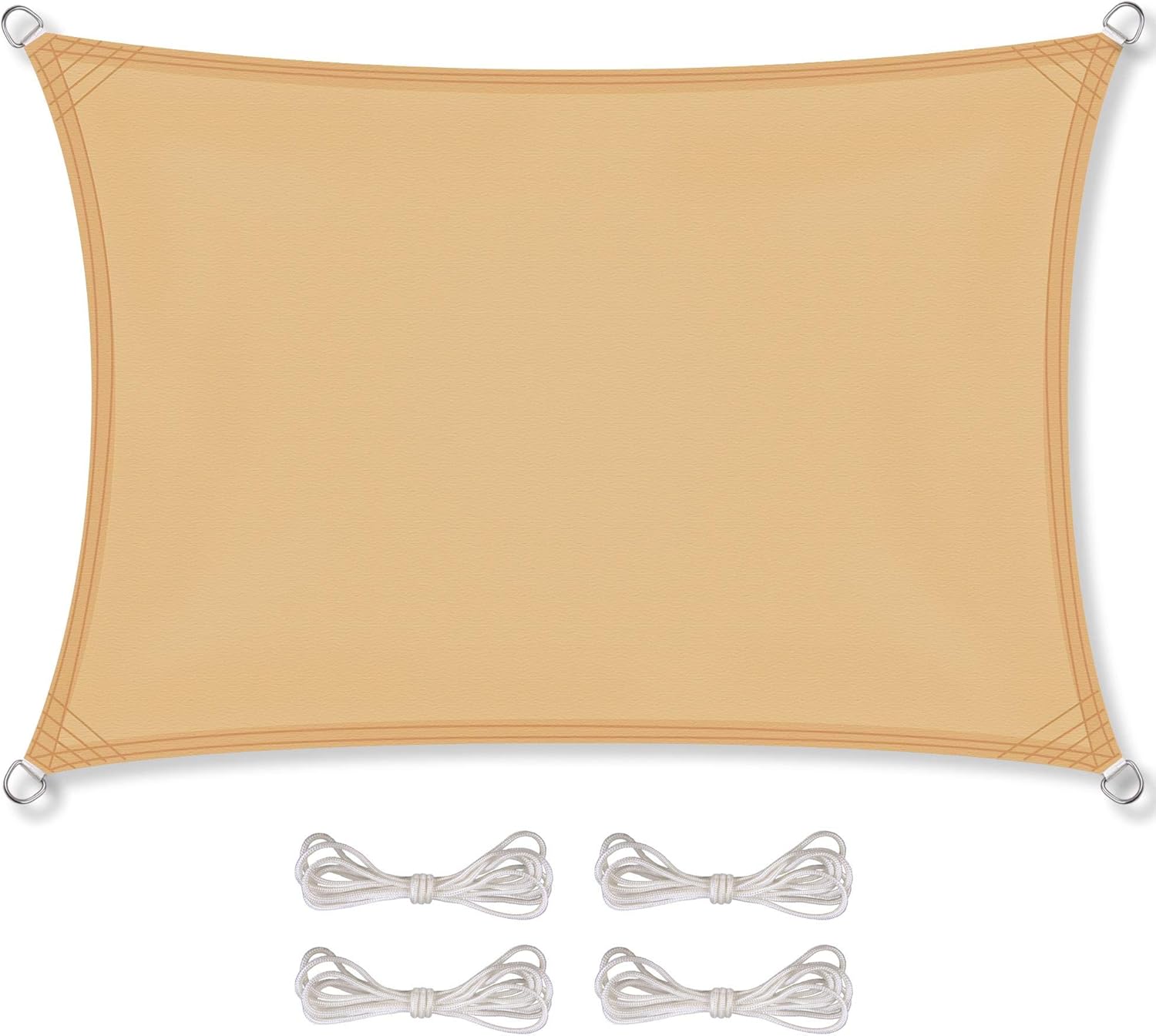 - 1x Sonnenschutzsegel wind- und wasserabweisend (PES), Farbe: sand-beige, Rechteck 2 x 4 m und 4x Befestigungsseile (je ca. 1,5m). 5-fach quer vernähte Edelstahlösen an den Ecken