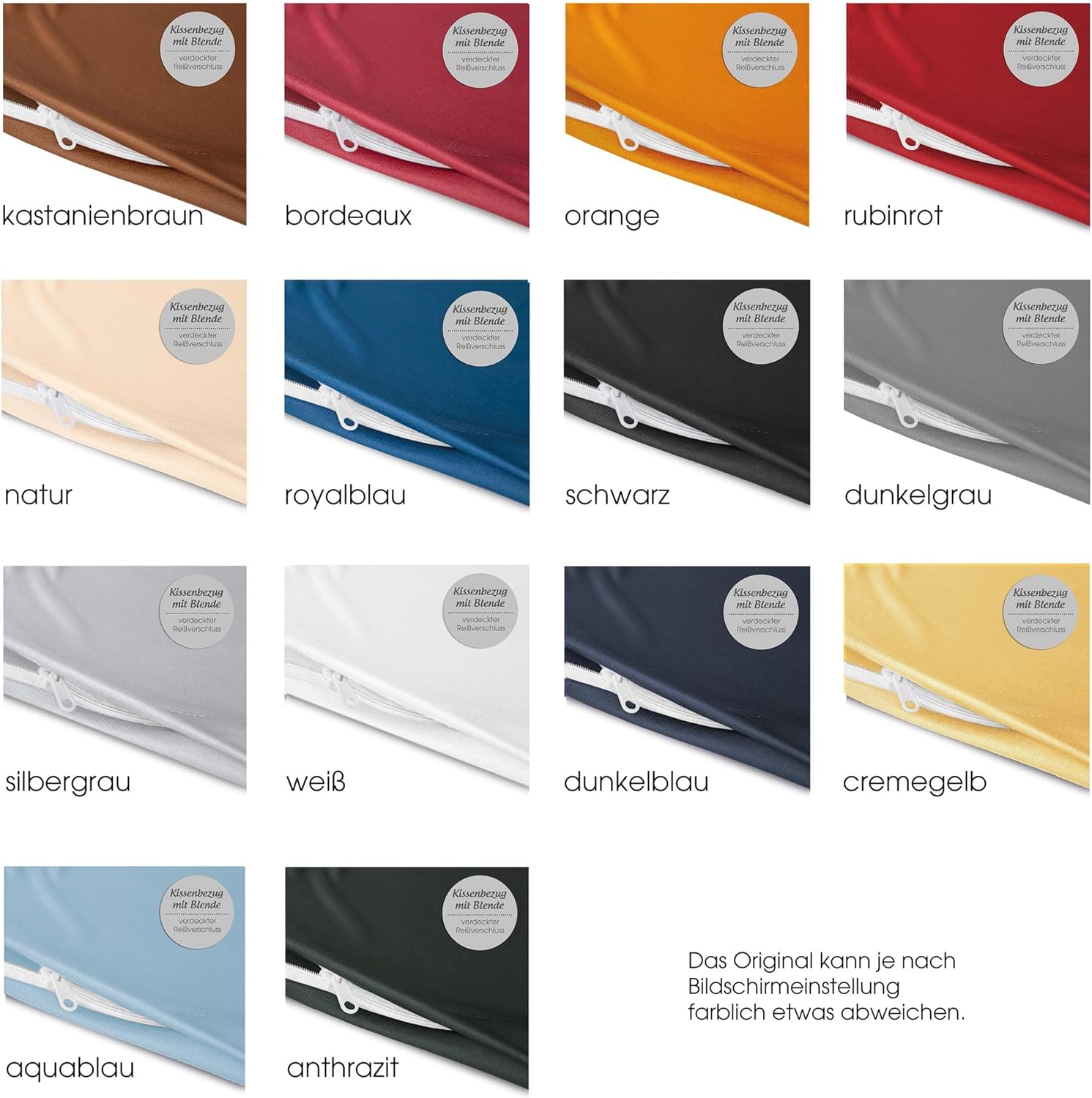 - Kissenüberzüge erhältlich in topaktuellen Farben anthrazit, aquablau, bordeaux, cremegelb, dunkelblau, dunkelgrau, kastanienbraun, natur, orange, royalblau, rubinrot, schwarz, silbergrau und weiss