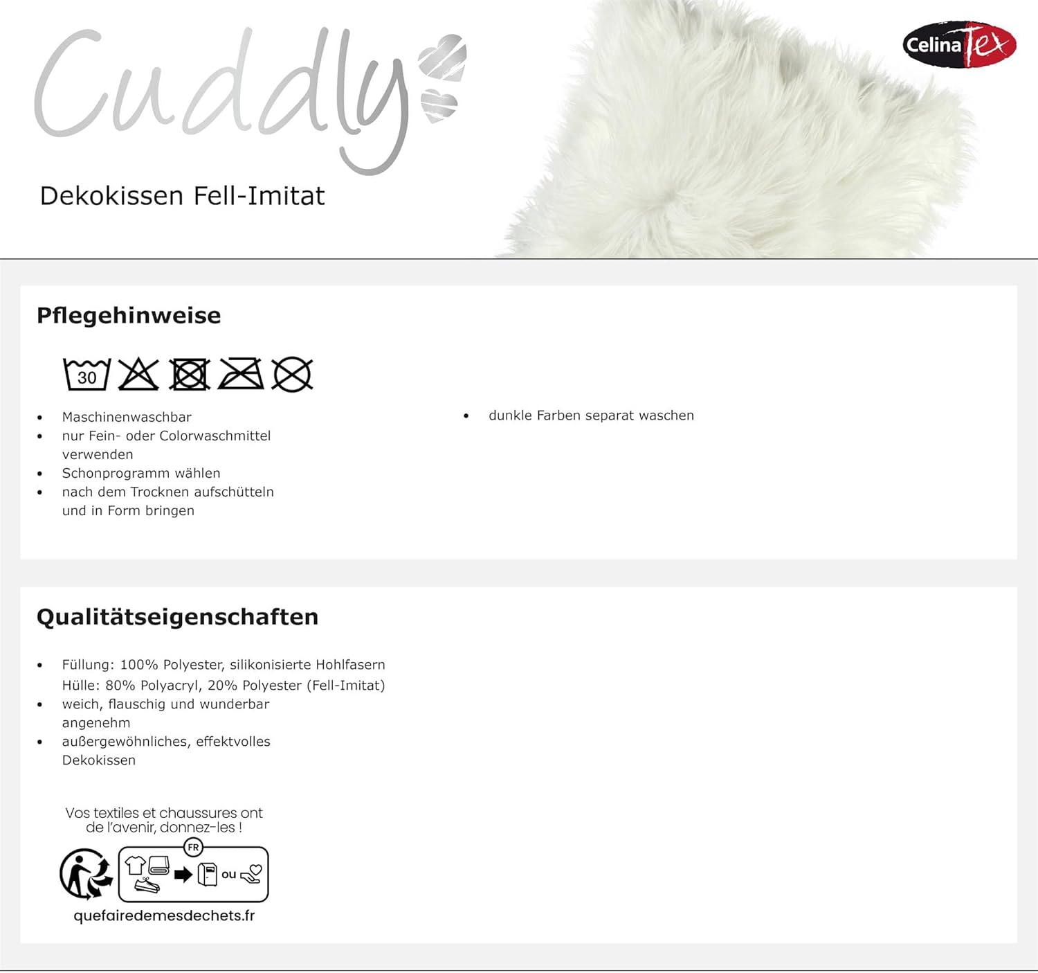 - CelinaTex Cuddly Fell Imitat Kissen haben eine aussergewöhnlich flauschige Fell-Imitat Ober- und Unterseite aus 80% Polyacryl und 20% Polyester mit einer Florhöhe von ca. 6cm