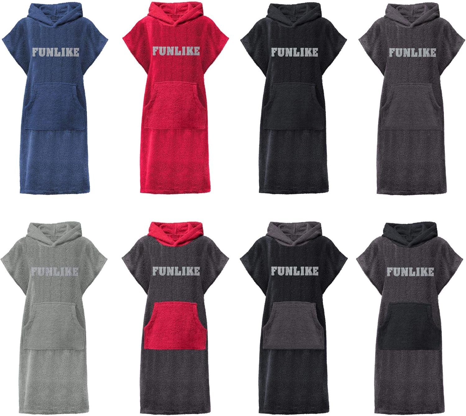 • stylischer Kurzarm Freizeit Poncho aus 100% reiner Baumwolle in angenehm weicher Frottee Qualität, mit Kapuze und Bauchtasche sowie einer modischen Brustbestickung Funlike in der Farbe silber
