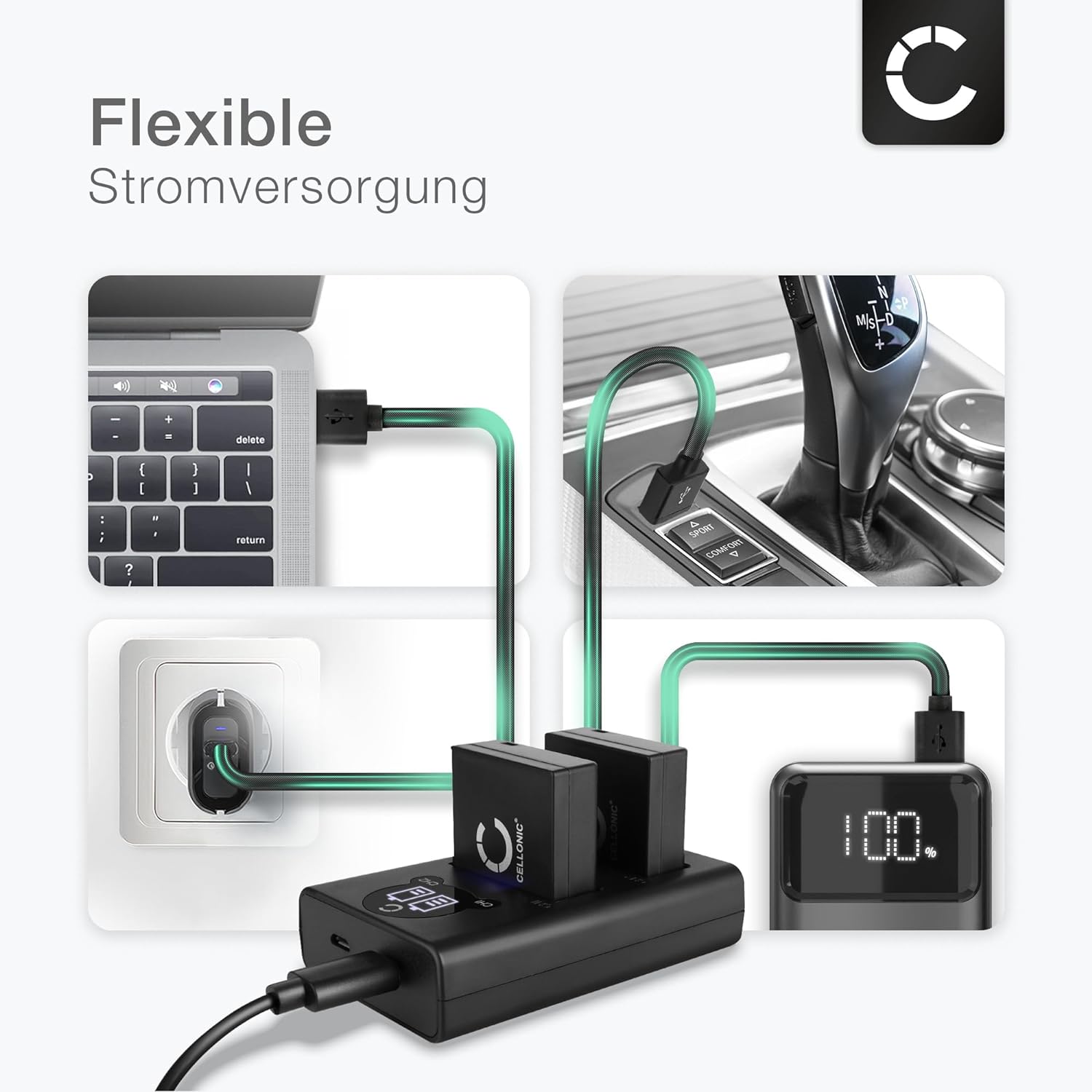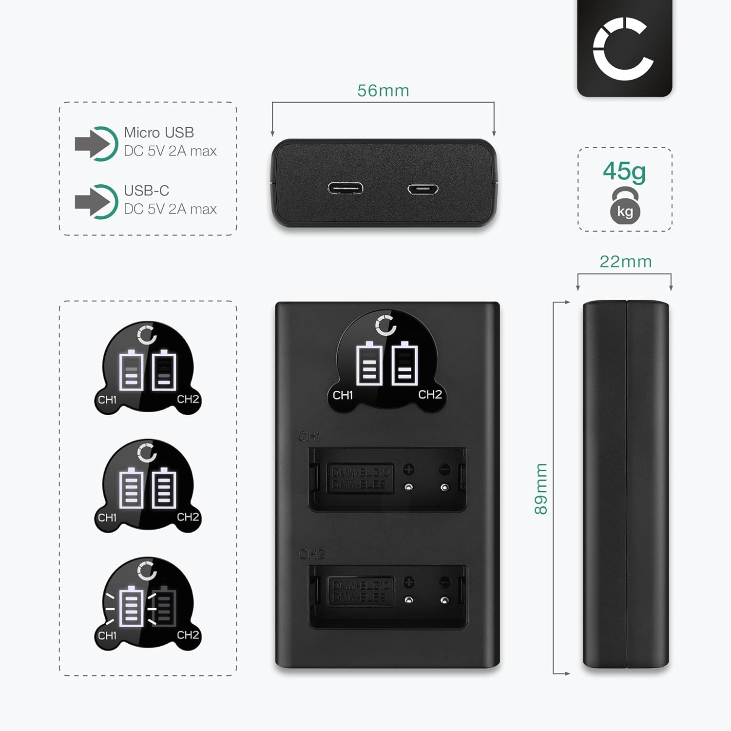 - PASST IN JEDE KAMERATASCHE - Die kompakte und platzsparende Bauform macht das kleine Doppelladegerät zum idealen Begleiter auf Reisen oder im Kfz - ein USB-C Kabel ist bereits inklusive, das Zweifachladegerät kann aber auch über den Micro-USB