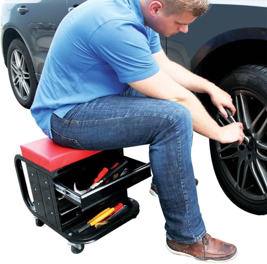 - Werkstatt-Stuhl mit 3 Schubladen und einem Ablagefach, auf Rollen
