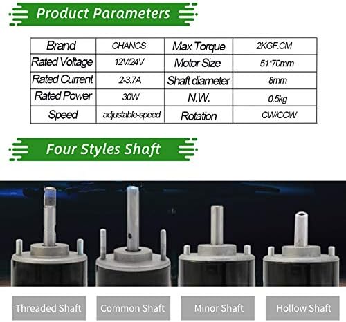 - *Die Spezifikation des Motors: Nennspannung: DC 12V, Unbelastete Geschwindigkeit: 3500RPM, Lastgeschwindigkeit: 2400RPM; Nennspannung: DC 24V, Leerlaufdrehzahl: 7000RPM, Lastdrehzahl: 5100RPM; Nennstrom: 2.42-3.37A; Nennleistung: 30W; Welle: