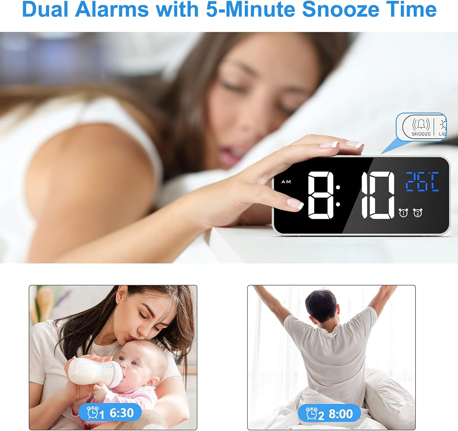 - 【2 Alarme mit Snooze-Funktion】Wecker hat zwei separate Alarmzeiten. Sie können 2 Alarme an einem Tag einstellen, um Ihre Zeit entsprechend zu planen. Die Schlummerfunktion ermöglicht zusätzliche 5 Minuten Schlaf, drücken Sie einfach die