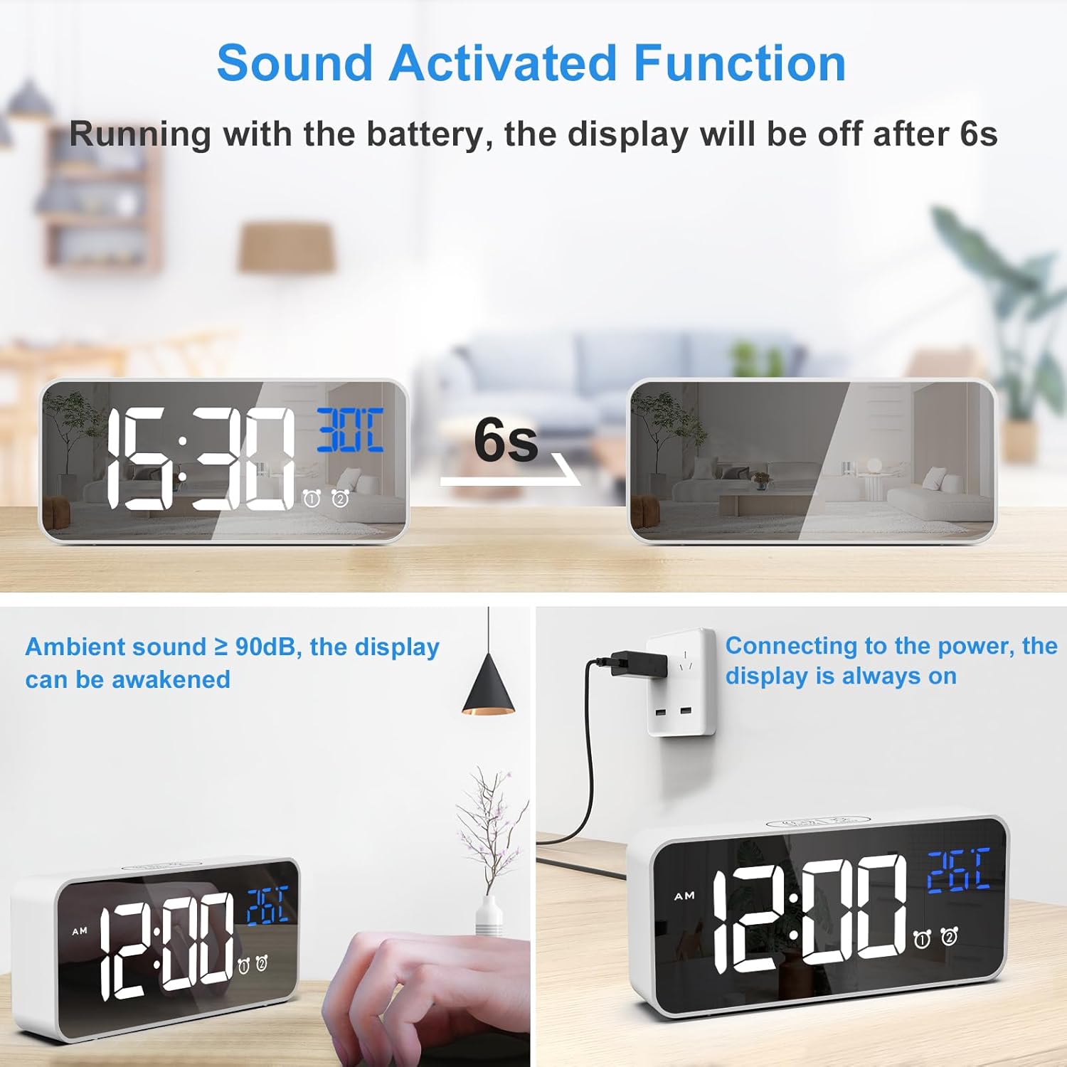 - 【Sprachsteuerung】Das LED-Display leuchtet auf, wenn der Ton erkennt oder wenn Sie die Taste "Snooze / Light" drücken. Schlagen Sie mit den Händen, schlagen Sie auf den Tisch, tippen oder einen Ton von mehr als 90 dB abgeben, um den intelligenten
