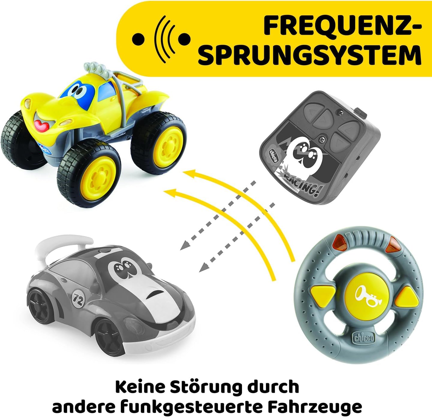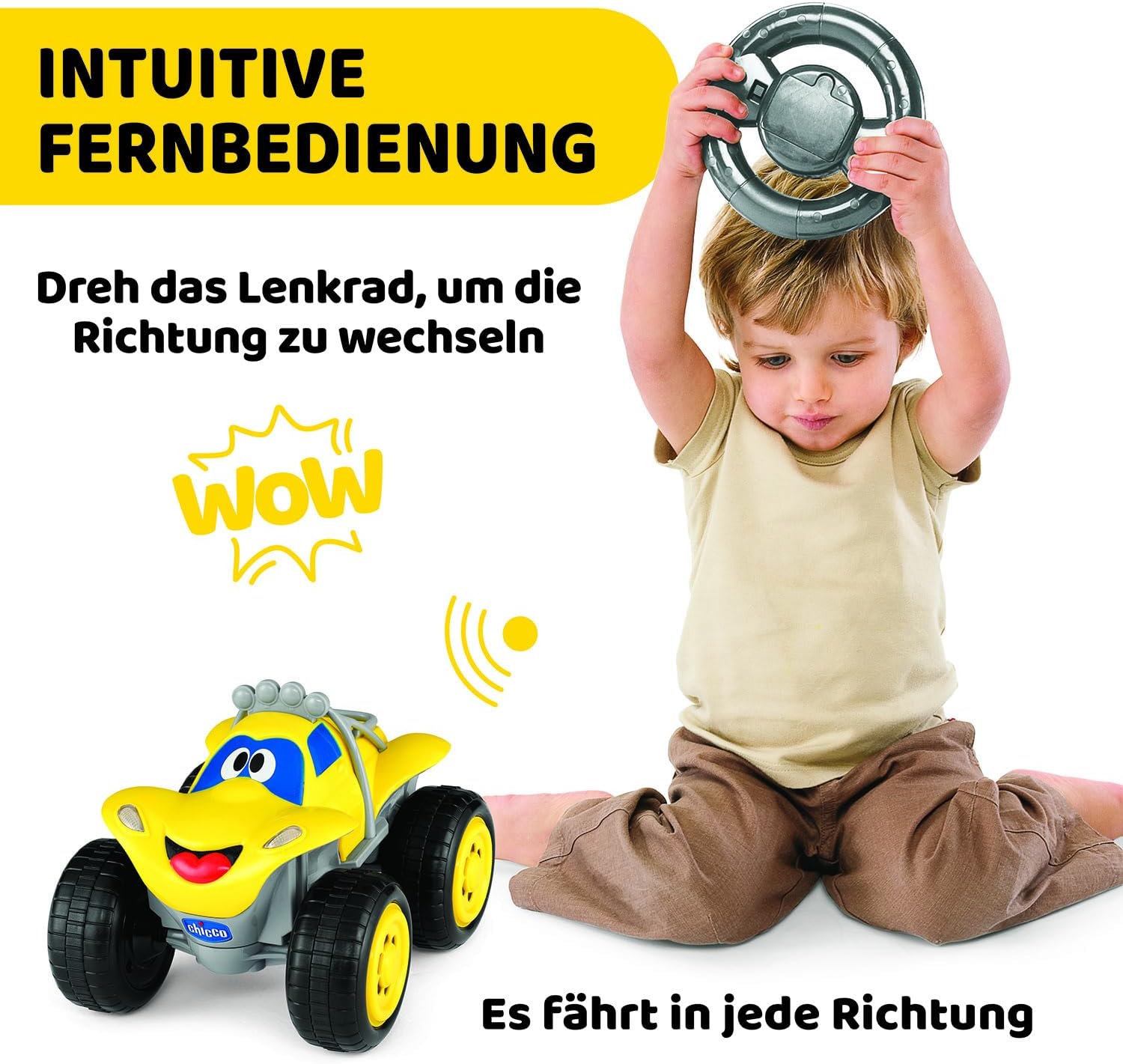 - FERNGESTEUERTES AUTO: Chicco Billy Bigwheels ist ein funkgesteuertes Fahrzeug, das sich in alle Richtungen bewegt, mit einem einfachen und intuitiven Fahrsystem und einer Betriebsfrequenz von 2,420-2,439 GHz