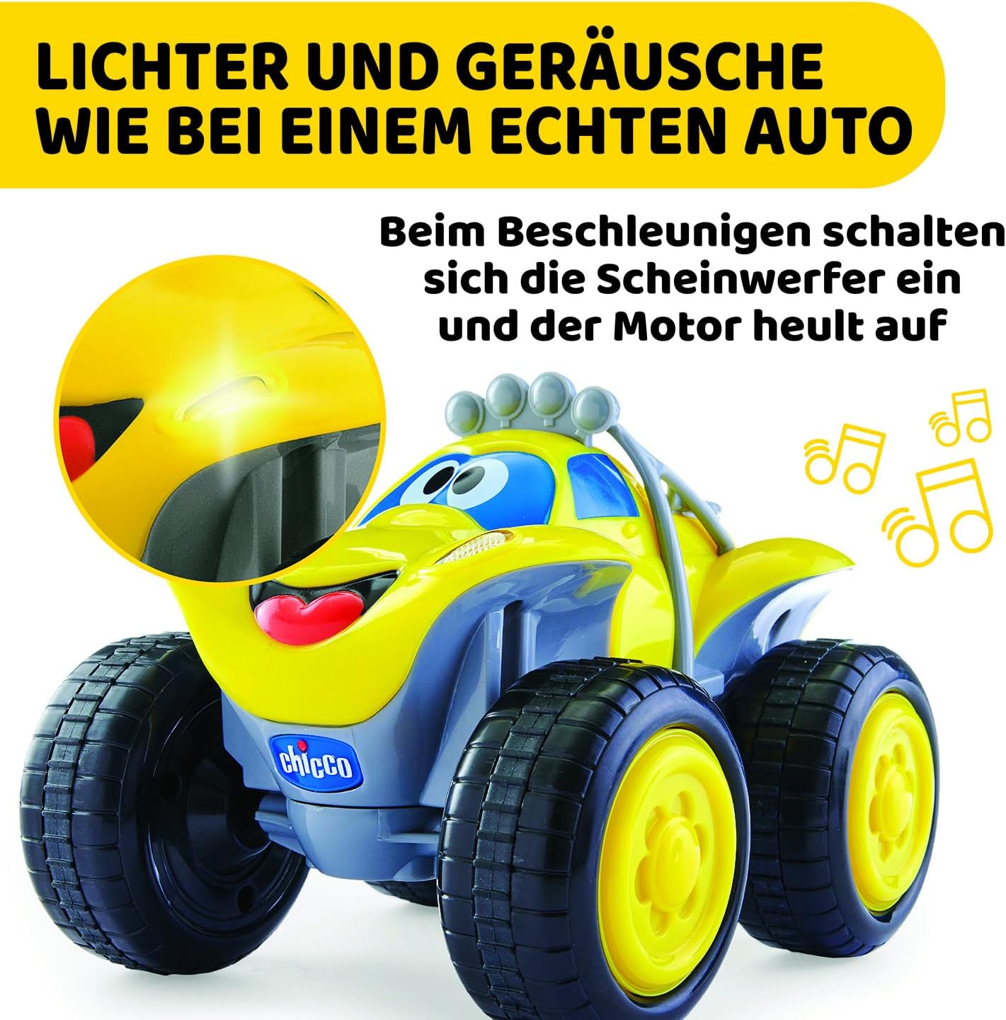 - LICHTER, GERÄUSCHE UND HUPE: Beim Beschleunigen leuchten die Scheinwerfer auf und der Motor röhrt, beim Rückwärtsfahren leuchten die Rücklichter auf und es ertönt ein Warnton. Die Hupe ertönt durch Drücken des mittleren Knopfes