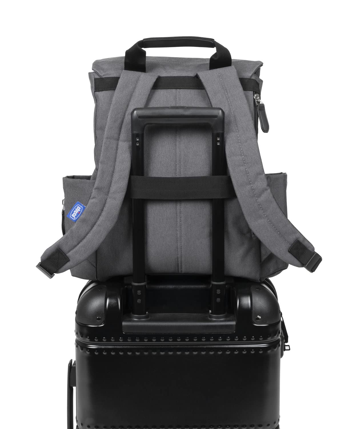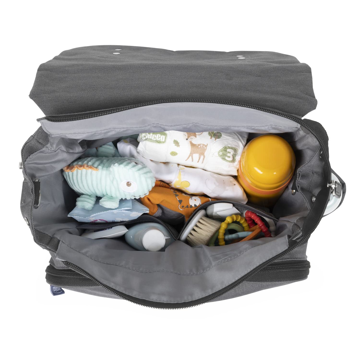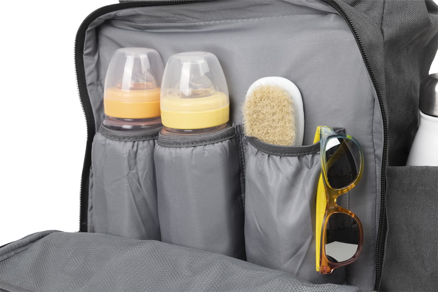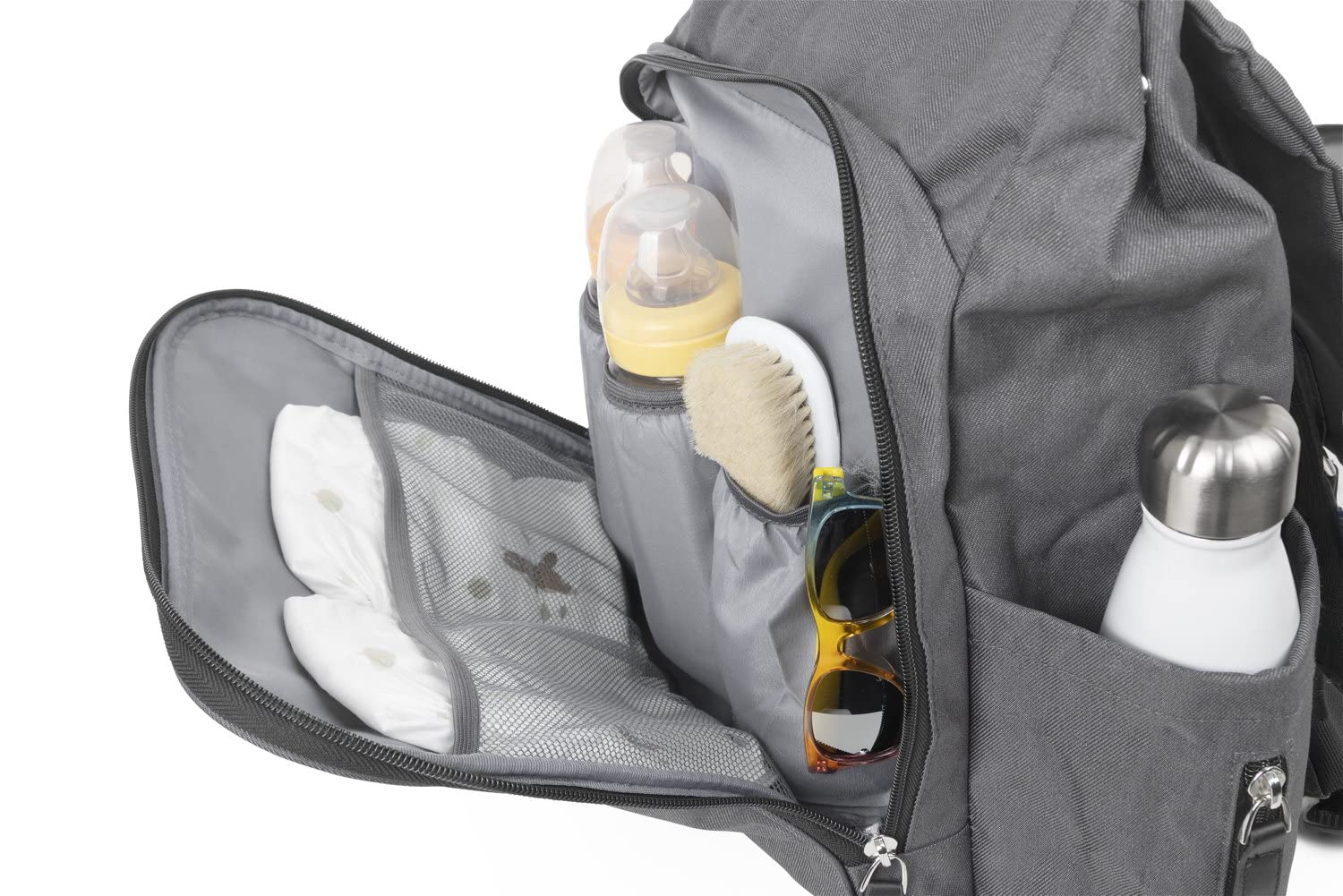 - Die zwei grossen Seitentaschen und das Hauptfach machen den Rucksack zu einer bequemen Lösung für Eltern, die weder auf Funktionalität noch Stil verzichten wollen.