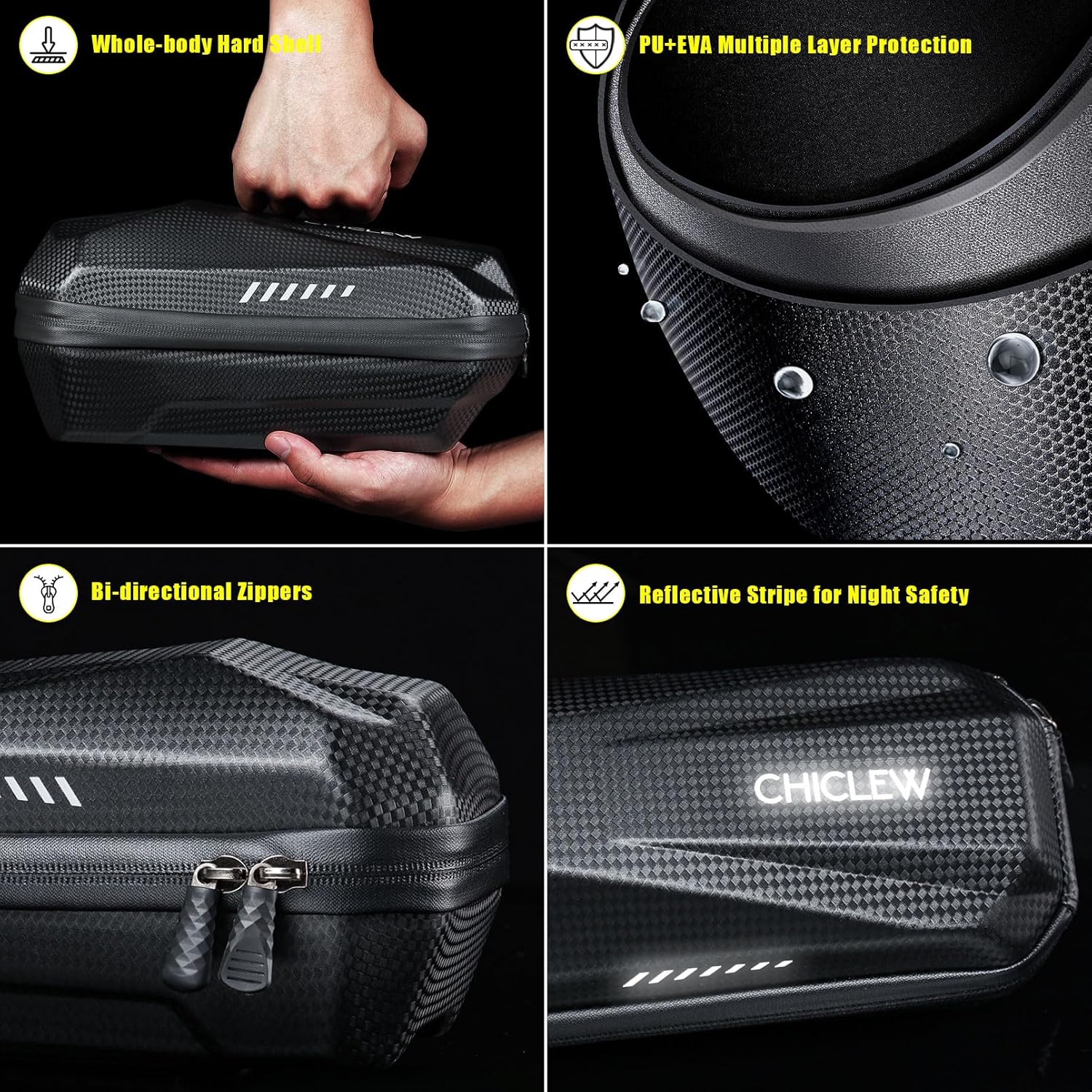 - Hartschalen-Schutz: Die starre EVA-Hartschale hilft der tasche e scooter, ihre Form zu behalten. Das einteilige Design sorgt für eine stärkere interne Struktur und bessere Stossdämpfung, um zu verhindern, dass Ihre Gegenstände herausfallen.
