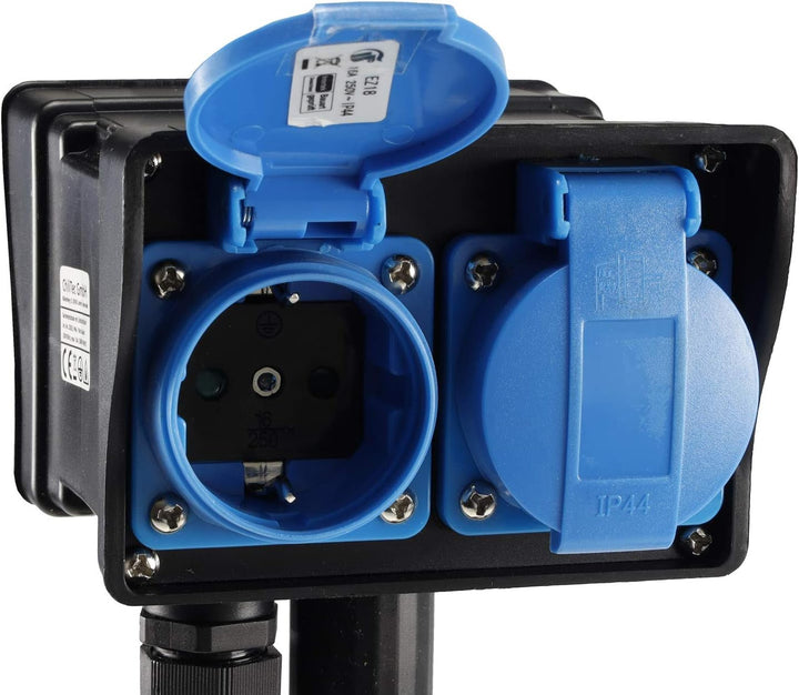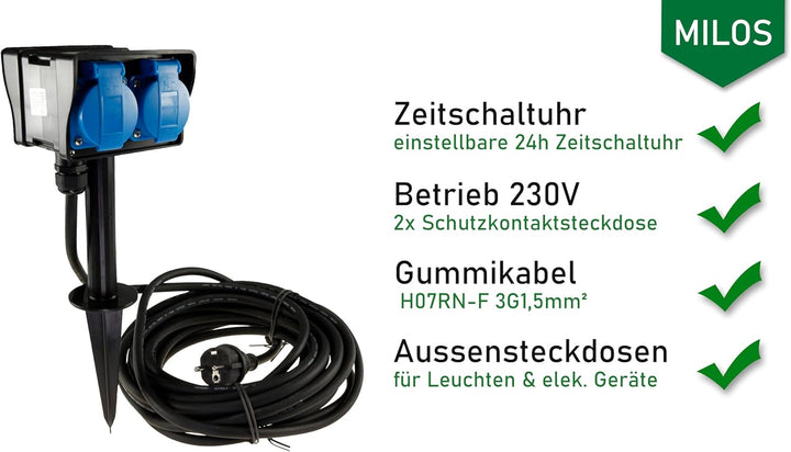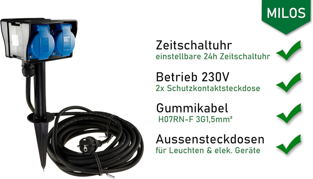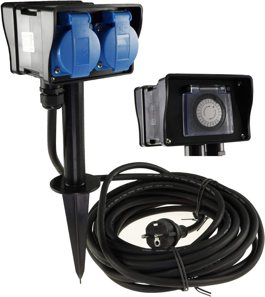 - PERFEKT AUSGESTATTET – Doppel-Steckdose mit 10m Zuleitung und Zeit-Schaltuhr zugelassen für den permanenten Einsatz im Aussenbereich wie Garten, Hof, Terrasse und Balkon. Schwere Gummileitung H07RN-F 3G1,5mm²