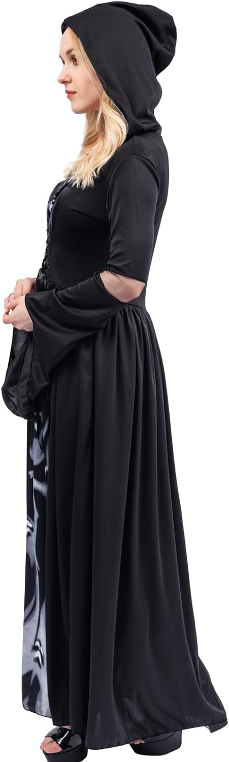 - Grusel Kostüm Damen:Durch stoffdruck Werden die Geisterschädel auf dem Kleid gezeigt, Und mit dem umhang und der verbundenen kapuze kann man sein gesicht gut Verstecken. Beides hilft dazu, Die wirkungen des Rollenspiels zu intensivieren.