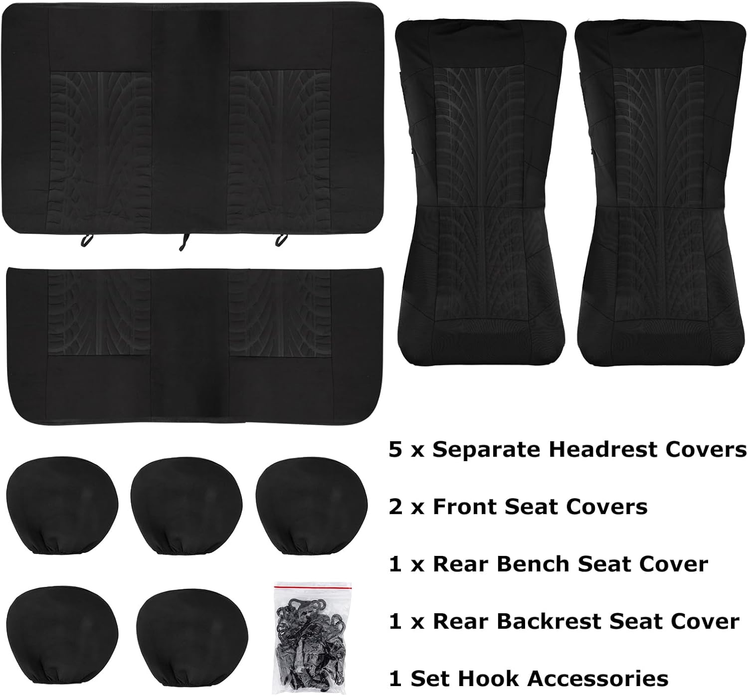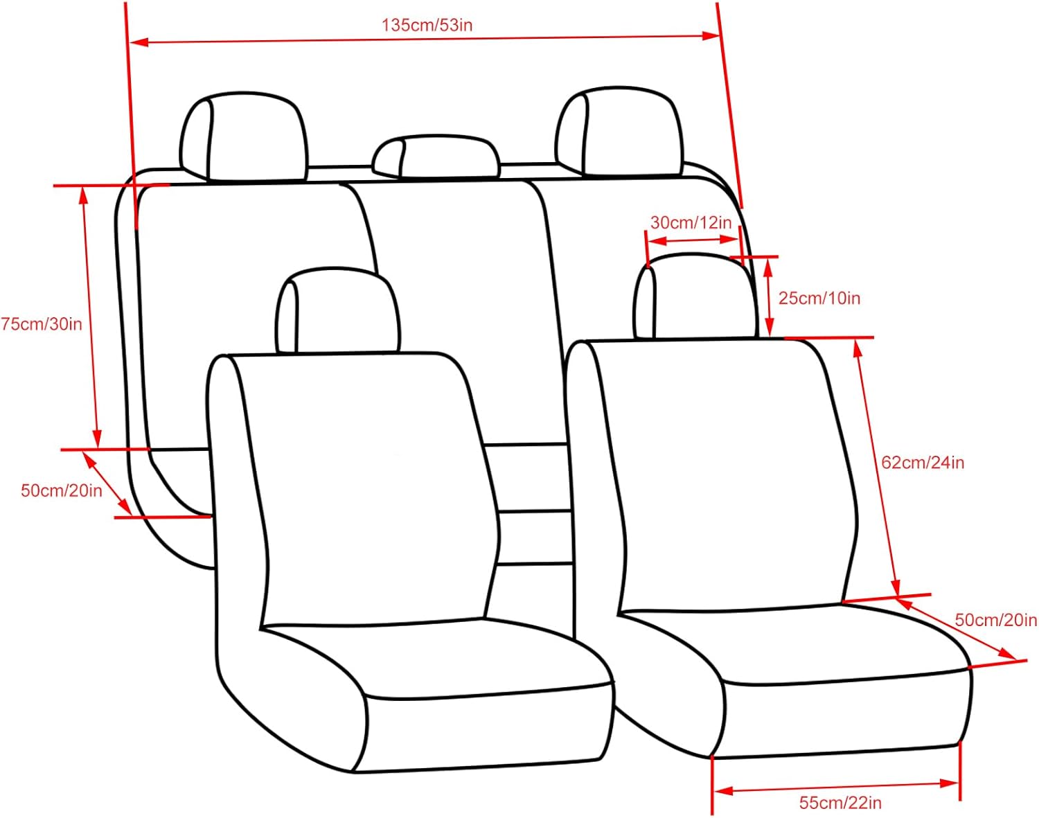 - Lieferumfang: 2 Vordersitzbezüge, 1 Rücksitzbezug, 1 Sitzbezug der hinteren Rückenlehne, 5 Kopfstützenbezüge und 1 Set Hakenzubehör
