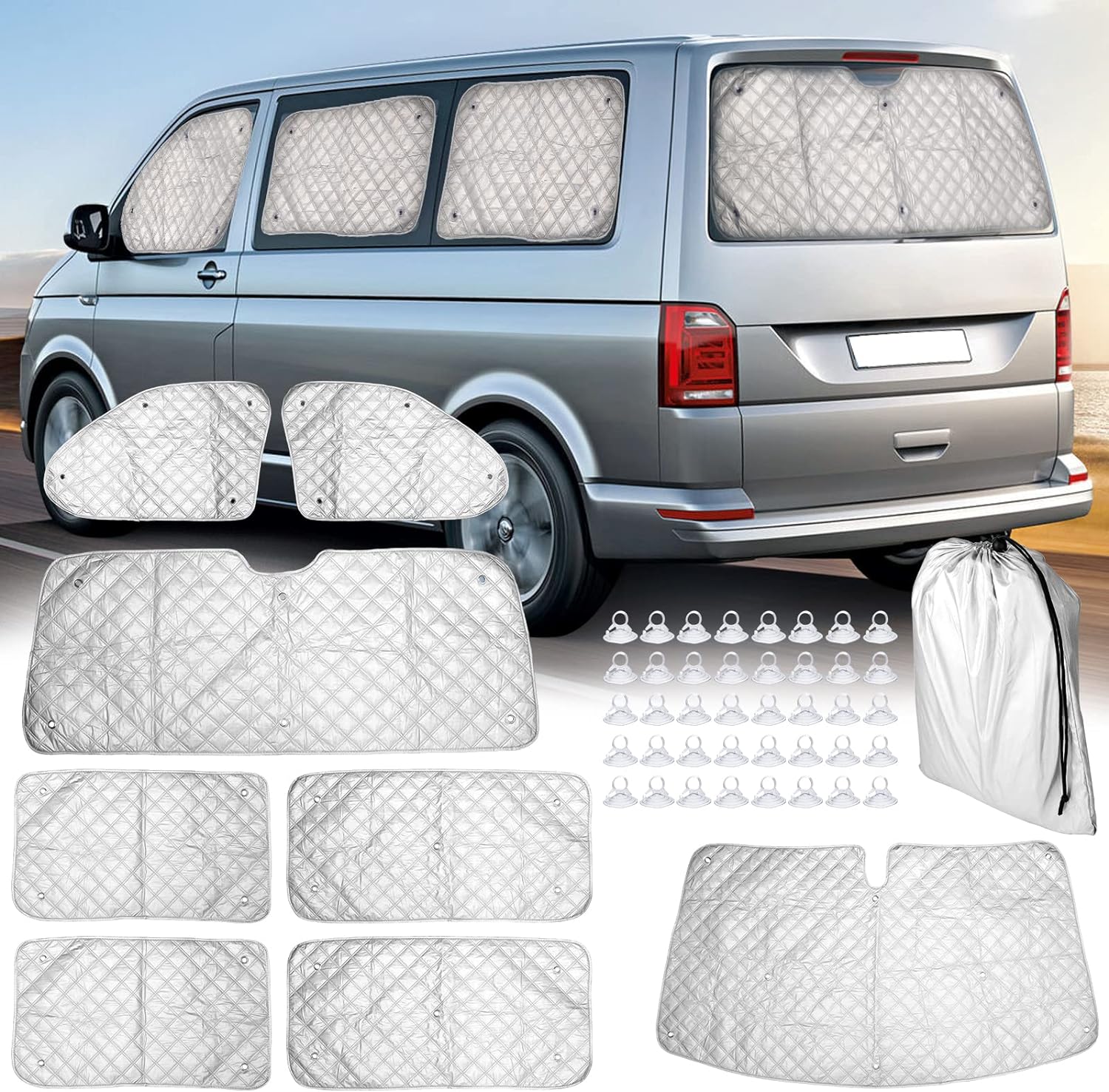 - Lieferinhalt: 1 x Windschutzscheibe Abdeckung, 6 x Seitenfenster Jalousien, 1 Heckscheibenabdeckung, 1 Aufbewahrungstasche und 1 Satz Saugnäpfe