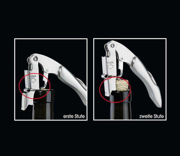 - 3 Funktionen, Kapselheber, Kapselschneider und zweistufiger Korkenzieher
