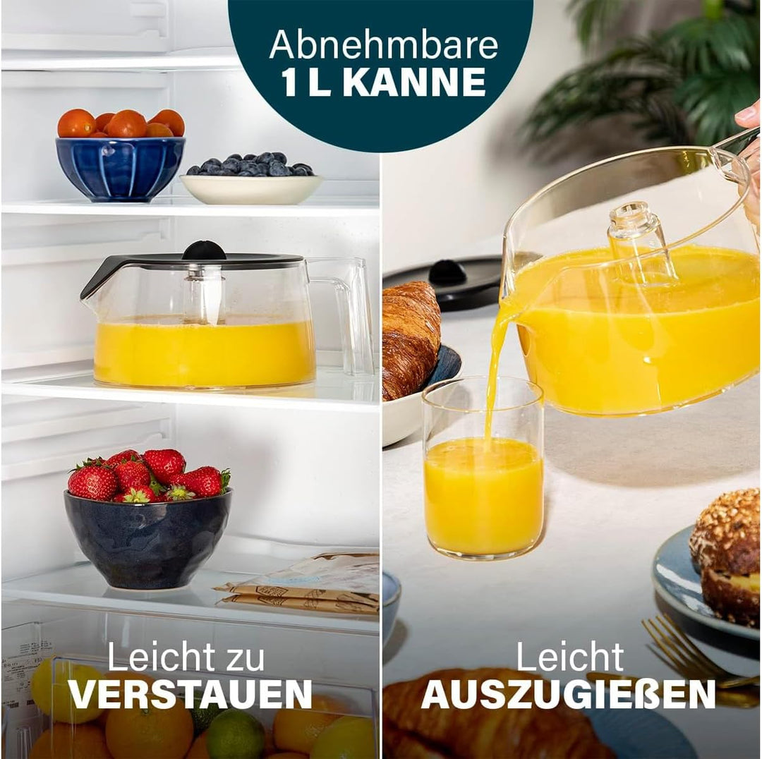 - Abnehmbare 1-Liter-Kanne mit Deckel ermöglicht auch die Aufbewahrung des Saftes im Kühlschrank