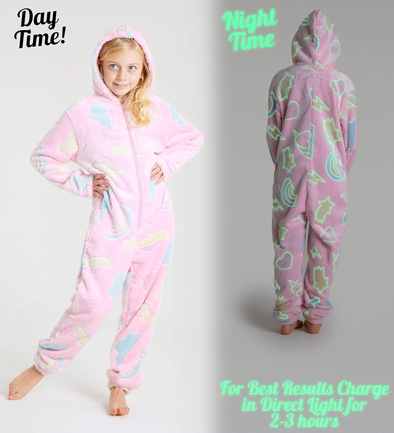 - LEUCHTET IM DUNKELN --- Der Onesie Kinder Jumpsuit zeigt hochwertige Einhorn und Stern Motive. Die Ränder der Abbildungen laden sich unter direktem Lichteinfall auf und leuchten sobald man das Licht ausschaltet