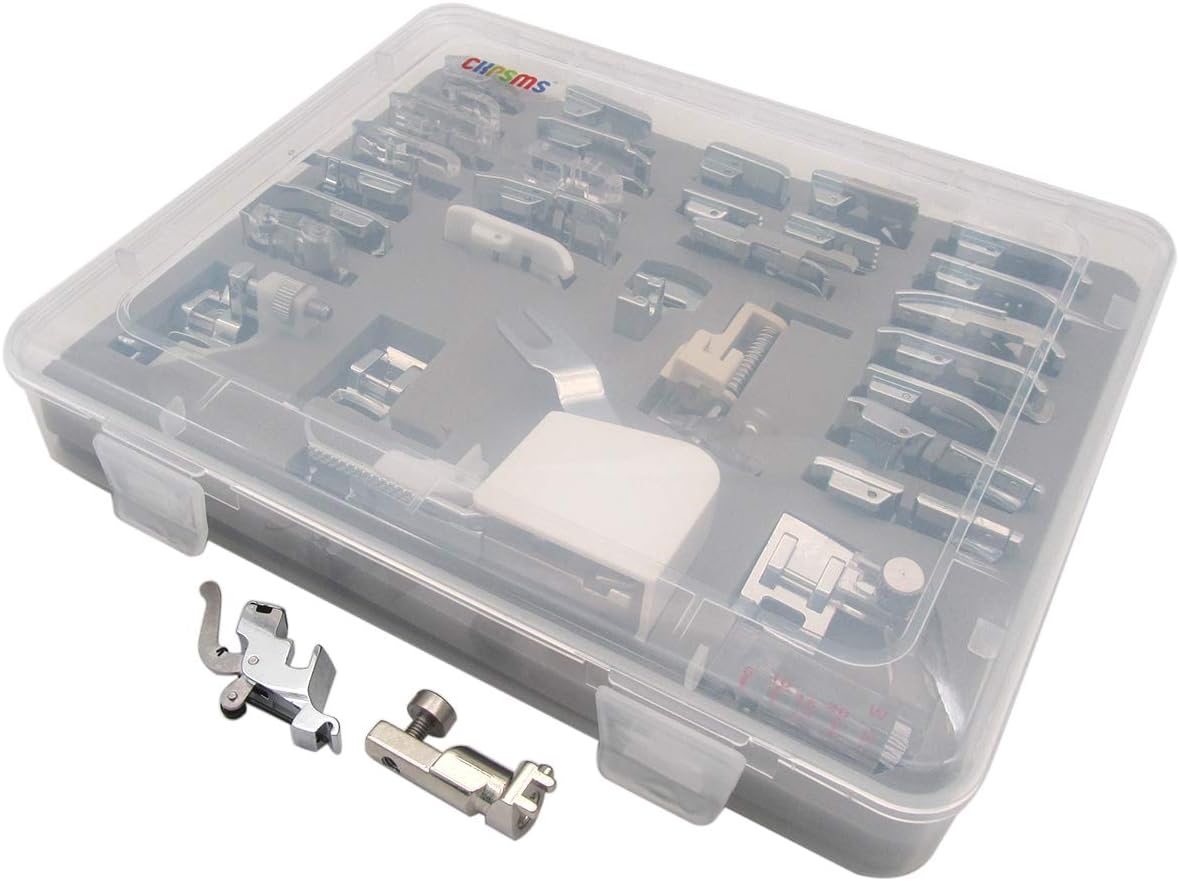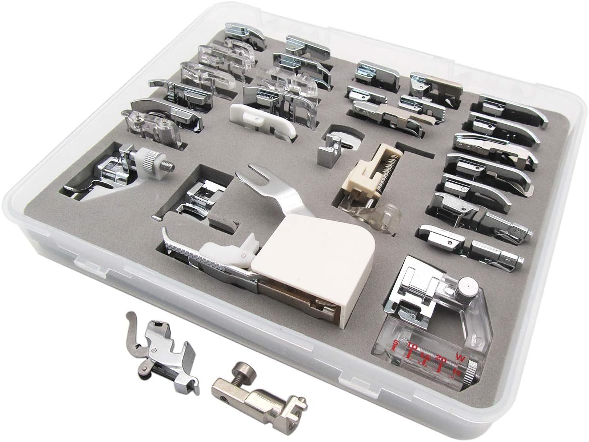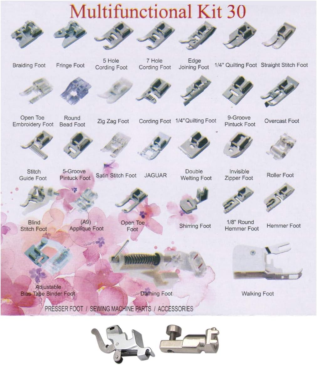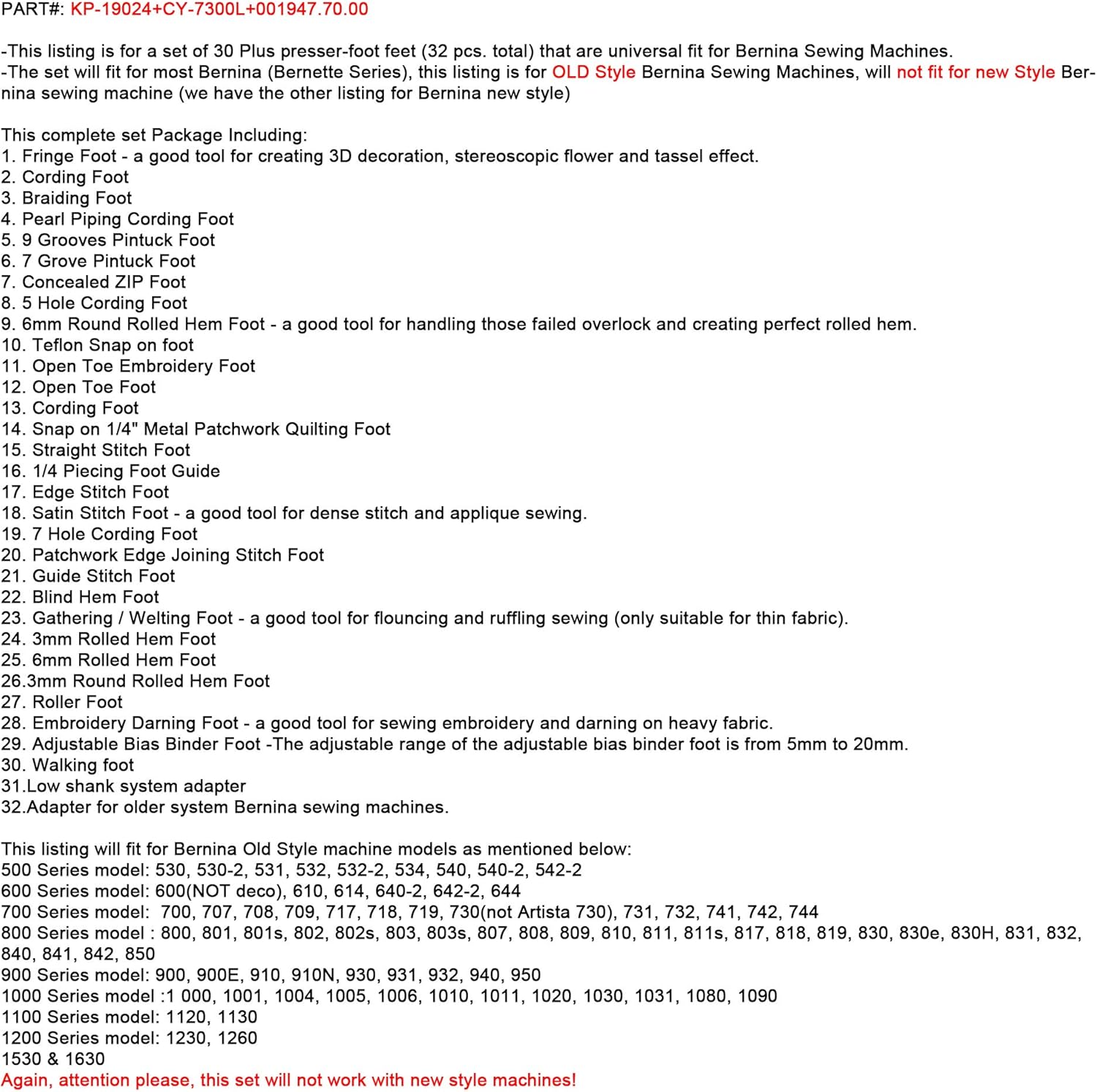 - Ein Satz von 30 Plus-Nähfussfüssen (insgesamt 32 Stück), die universell für Bernina-Nähmaschinen geeignet sind. Nochmals, bitte beachten Sie, dass dieses Set nicht mit Maschinen neuen Stils funktioniert!