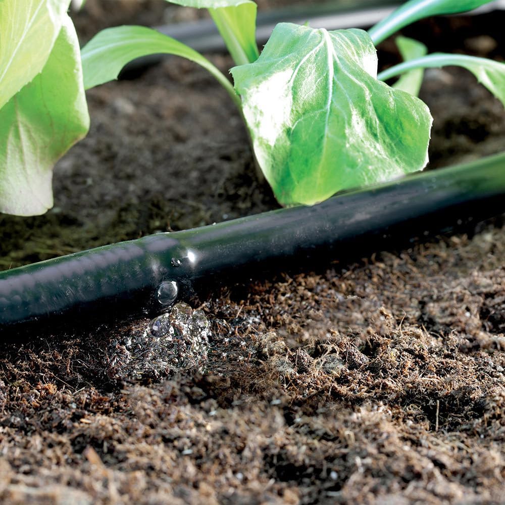 - PE-Rohr 1/2” (13 - 16 mm) mit integrierten, labyrinthartig angeordneten Tropfern (positioniert alle 33 cm), die jeweils 2 Liter/Stunde ausgeben und eine extrem gleichmässige Ausgabe auf der gesamten Fläche gewährleistet.