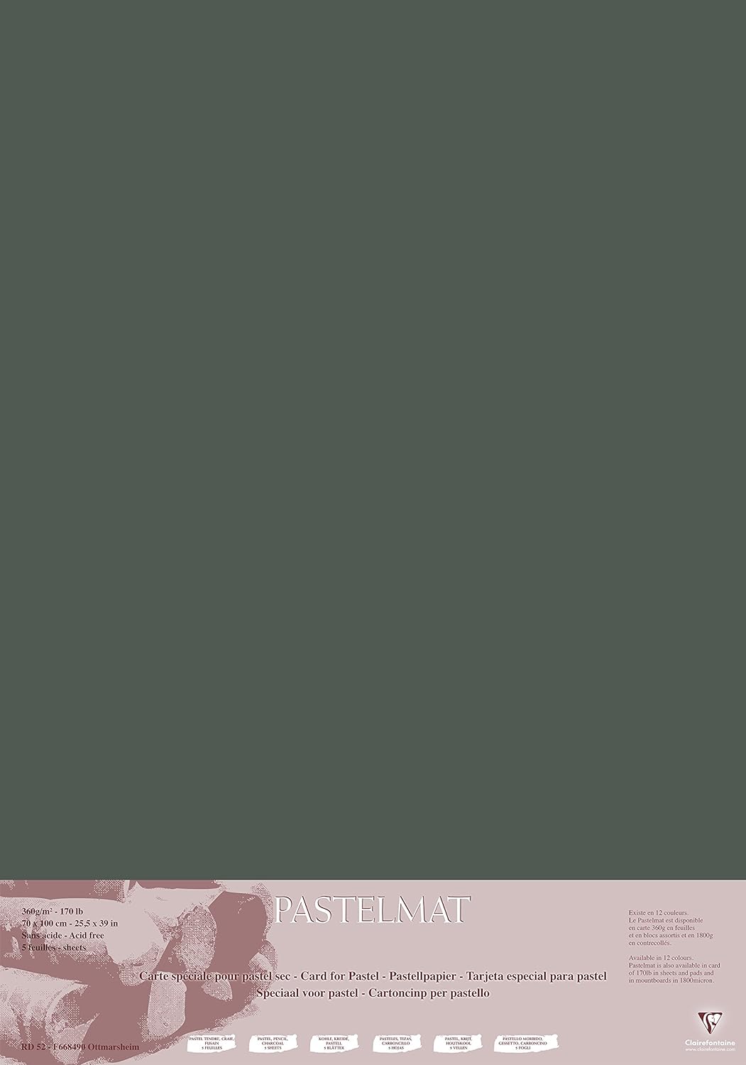 - Zeichenbögen Pastelmat von Clairefontaine. Die Packung enthält fünf Bögen Format: 70 x 100 cm. Farbe: anthrazit. Ideal für Trockentechniken und Pastell. In Frankreich produziert. Ein Beweis aus herausragende Qualität