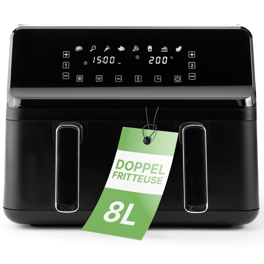 • Mit einer Kapazität von 8,0 Litern und zwei getrennten Behältern bietet unsere Heissluft-Fritteuse Platz für all deine kulinarischen Ideen – doppelte Freude, doppelter Geschmack
