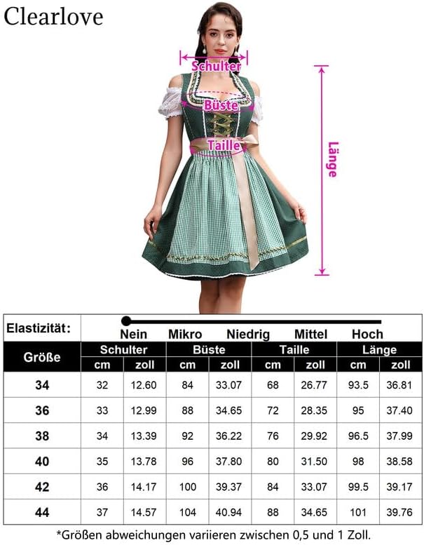 - Dirndl Kleid: Mit Reissverschluss, geschmückt mit Metallknopfträgern und raffinierten Kanten sorgt dieses Dirndl für einen hochwertigen Look.