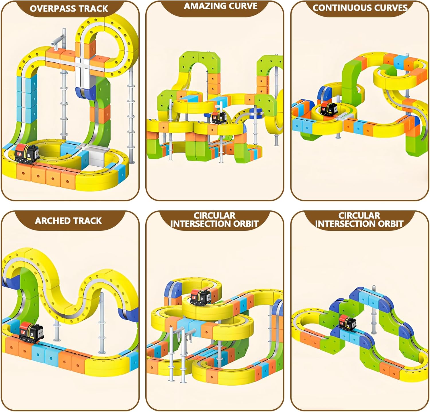 - 🧩 MODULARER BAUkASTEN FÜR KREATIVITÄT: Das modulare Schienensystem mit Kurven, Brücken und Drehelementen ermöglicht unzählige Schienenlayouts. Kinder entwerfen ihre eigenen Strecken und fördern dabei räumliches Denken, Ingenieursfähigkeiten