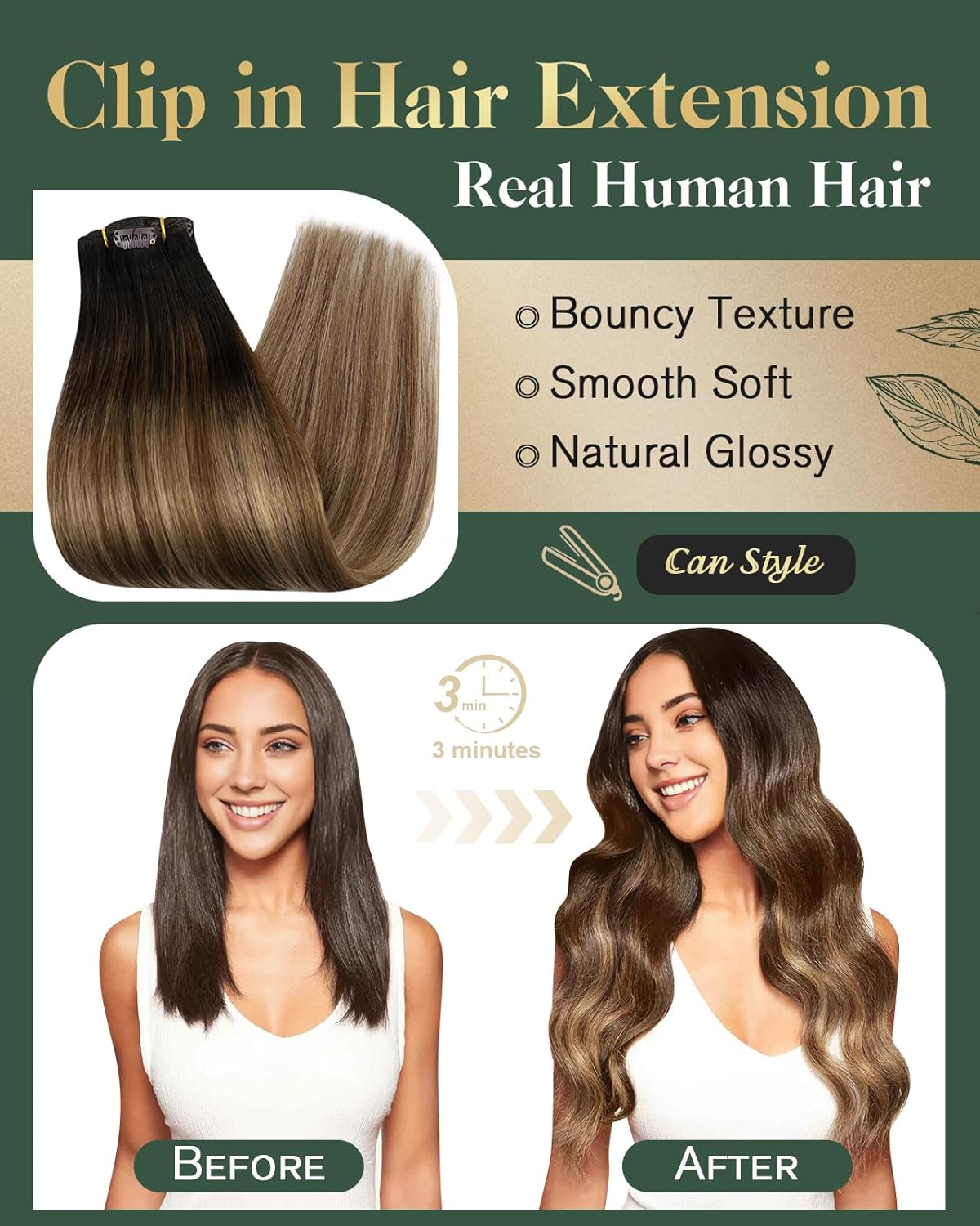 Clip in Extensions Echthaar Balayage Haar, Ugeat Dunkelstes Braun to Mittel Braun Clip Hair Extensio