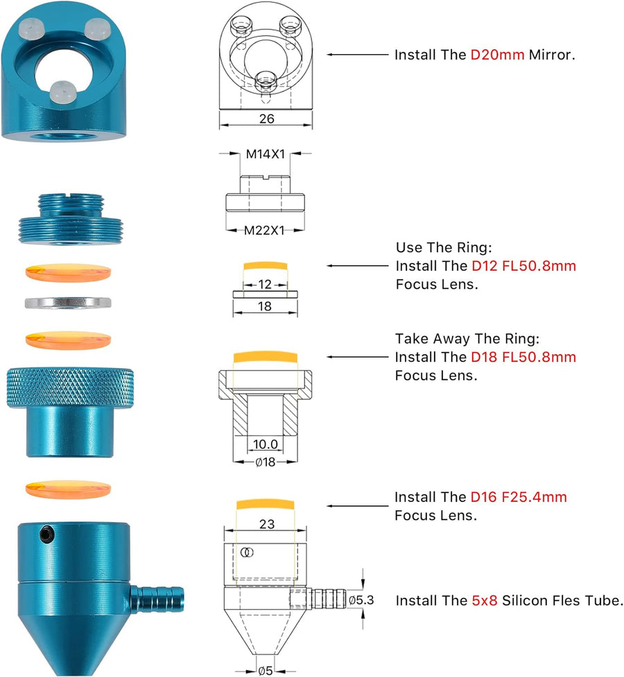 - 【𝐒𝐮𝐠𝐠𝐞𝐬𝐭𝐢𝐨𝐧】 Air-assist-Anschlussposition, empfehlen Sie 5x8 Siliziumflemenröhrchen (Innendurchmesser, 5 mm).