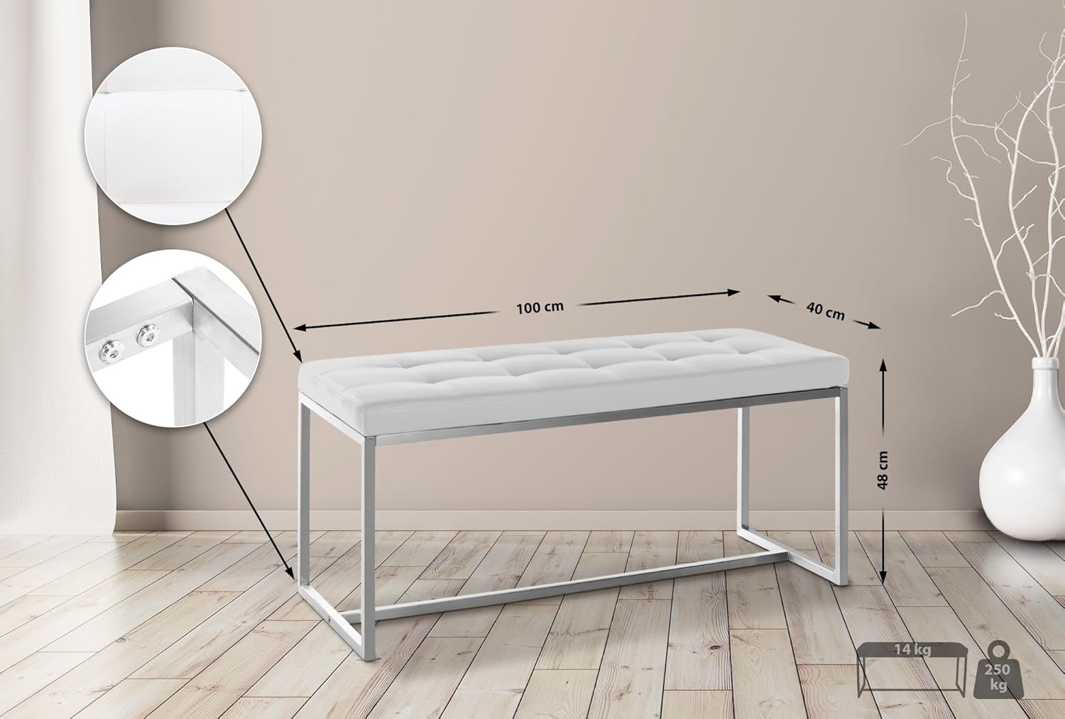 - Durch das schlichte und moderne Design lässt sich die Bank gut in verschiedenste Räumlichkeiten integieren. Ob im Wohnzimmer, im Flur oder im Esszimmer