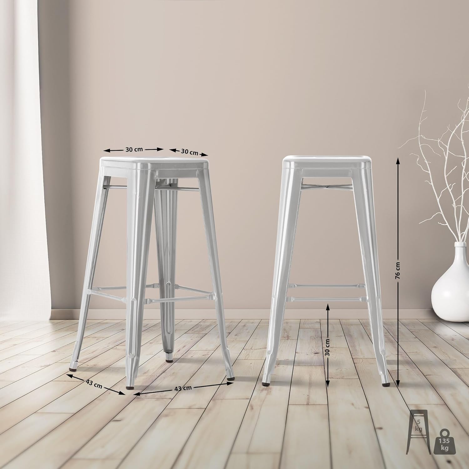 - Ca. Produktabmessungen: Höhe: 77 cm | Breite: 43 cm | Tiefe: 43 cm | Sitzhöhe: 77 cm | Sitzfläche: 30 x 30 cm | Material: Metall | Gewicht: 5 kg | Hinweis: Der Barhocker wird montiert geliefert.