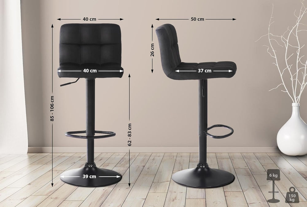 - Das Gestell ist aus matt schwarzem Metall gefertigt und besonders stabil. Die stufenlos verstellbare Sitzhöhe ermöglicht eine optimale und bequeme Sitzhaltung. Durch die Höhenverstellbarkeit passt Feni an jede Theke.