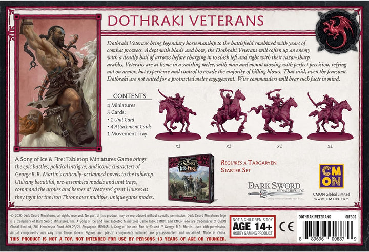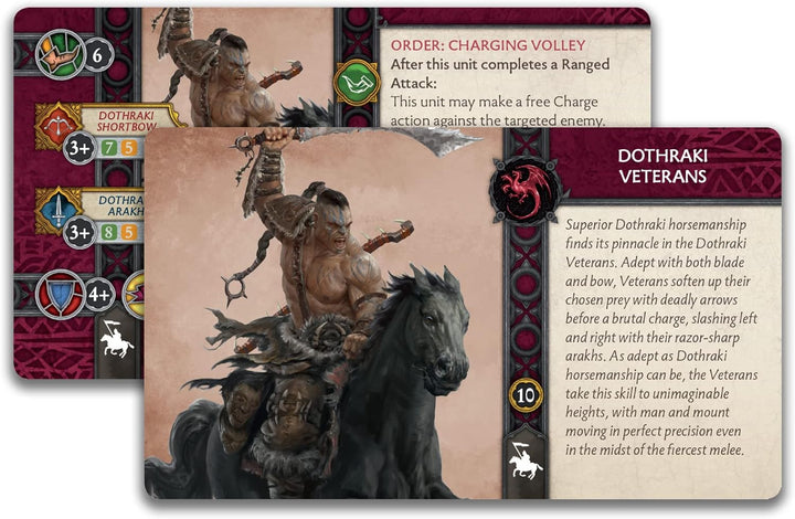 - Die Dothraki Veteranen-Einheit Box gibt den Spielern des Hauses Targaryen eine vielfacettierte neue Bedrohung, um ihren Armeen hinzuzufügen. Diese Krieger haben ihre Fähigkeiten bis zum Maximum trainiert, in der Lage, Angriffe auf Reichweite und im