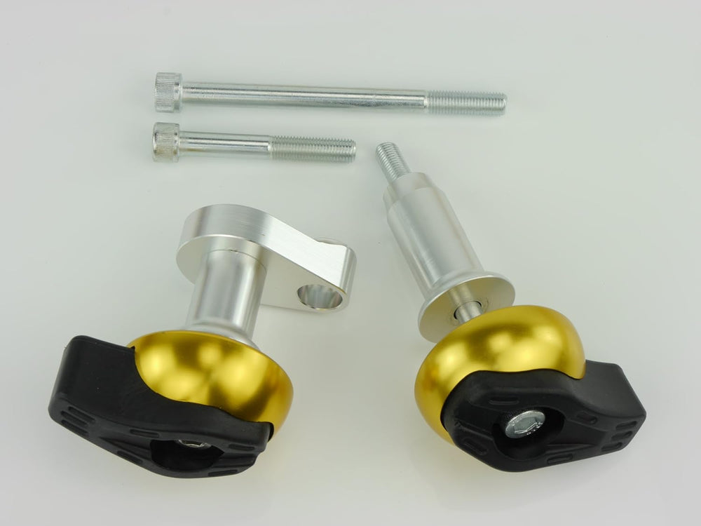 PRODUKTBESCHREIBUNGEN CNC Alu-Sturzpads mit Befestigungssatz Bestehen aus: 1 Aluminium-Abstandshülse 40 mm 1 Aluminium-Abstandshülse 62 mm lang 2 farbig eloxierte CNC gefrässte Aluminiumhalbrunde ( Durchmesser 64 mm ) 2 Kunstoff-Schlagschutz-Einsätzen mit einer Länge von 8 cm 2 Alu-Führungshülsen 1 Befestigungsschraube mit 70 mm Länge 1 Befestigungsschraube mit 80 mm Länge 2 Befestigungsschrauben mit 130 mm Länge 1 Alu-Befestigungsplatte zur Montage an Motorhalteschraube Die Verkleidung muss zur Montage der CNC-Sturzpads nicht ausgeschnitten werden. Montagebeispiel siehe 2. Bild. Die Form und Aufbau des Schlagschutzeinsatzes ist gedacht den Aufprall bei einem Sturz abzufangen und durch seine längliche Form die Kräfte auf eine grössere Oberfläche zu verteilen. Der halbrunde Kopf der Sturzpads verhindert das Verhaken mit Fahrbahnunebenheiten. Achtung: Wenn Sie kein Mechaniker sind, wenden Sie sich bitte an eine Werkstatt. Vor dem Anbau beachten: Bei der Montage der Sturzpads nicht beide Motorhalteschrauben gleichzeitige lösen. Eine Seite nach der anderen montieren. Drehmomente der Motorbefestigungsschrauben beachten.