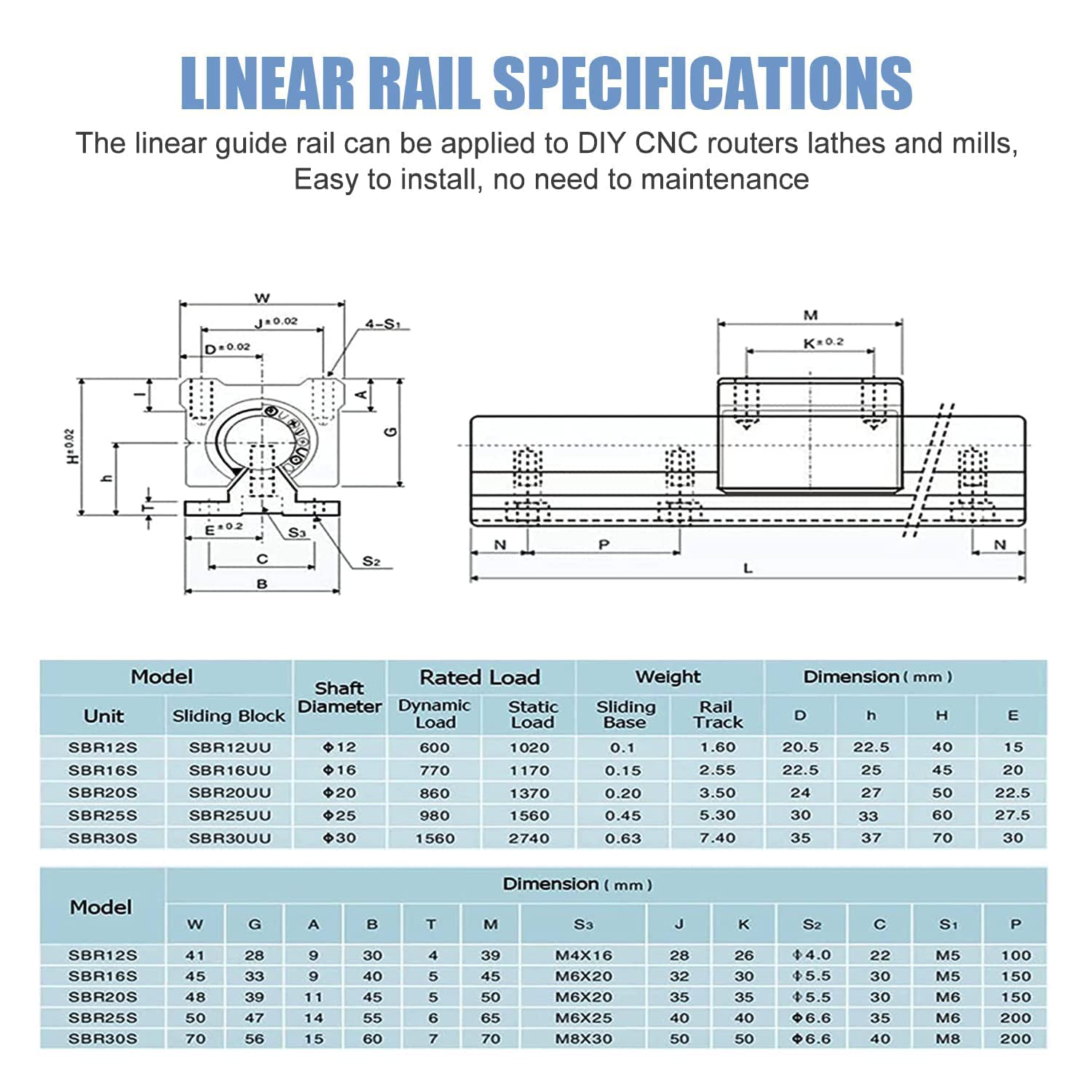 - Dieses lineare Schienenset enthält 2 Stücke 800 mm lange Schienenwellen mit 4Stücke SBR20UU-Blöcke und 4Stücke 20mm Anschlagsicherungsring.