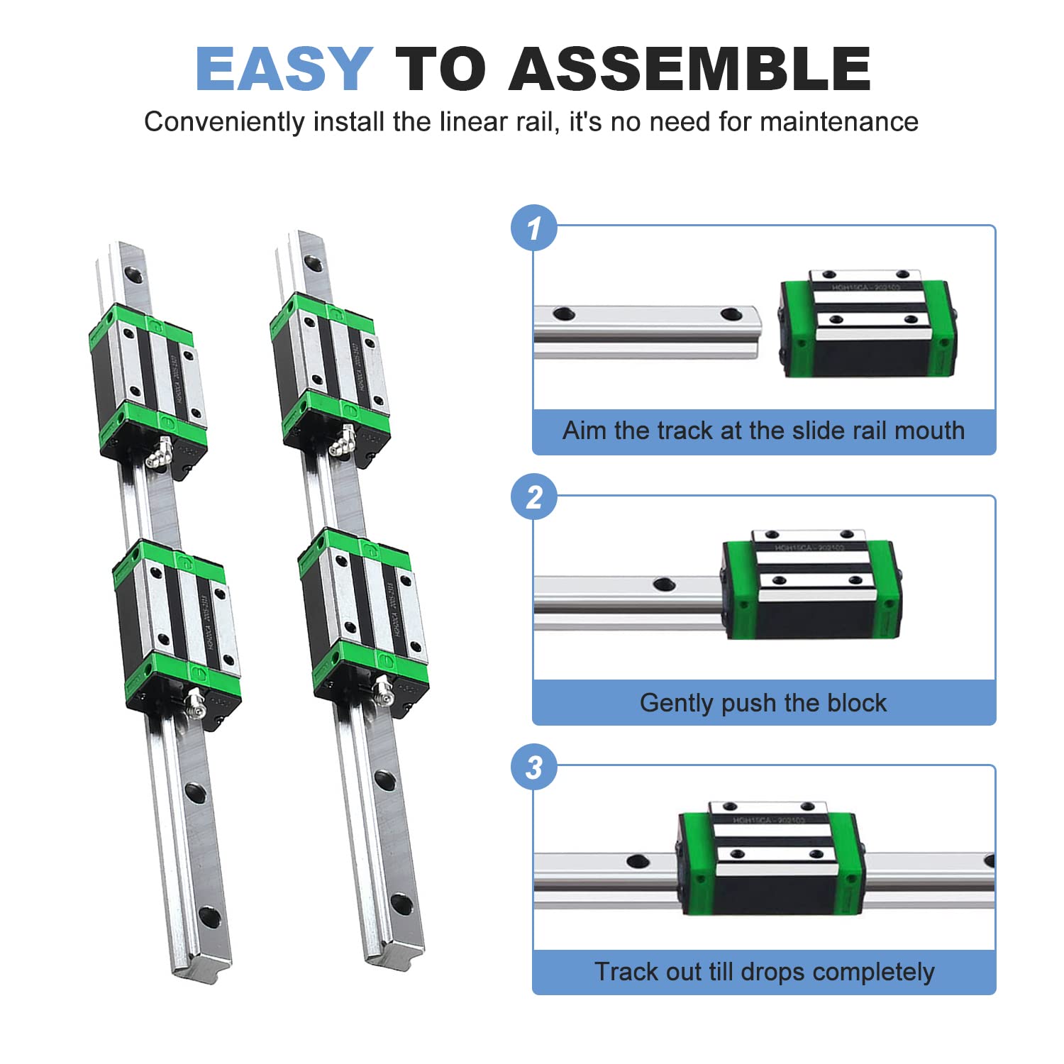 - Dieses lineare Schienenset enthält 2 Stücke 700mm lange HGR20 Schienenwellen und 4 HGH20CA Blöcke. Der Gleitblock wird in Verbindung mit der Schiene verwendet und das interne lineare Lager sorgt für ein sanftes Gleiten.