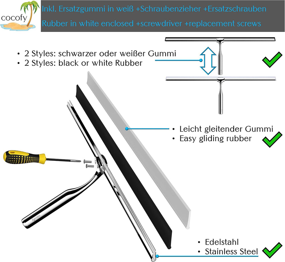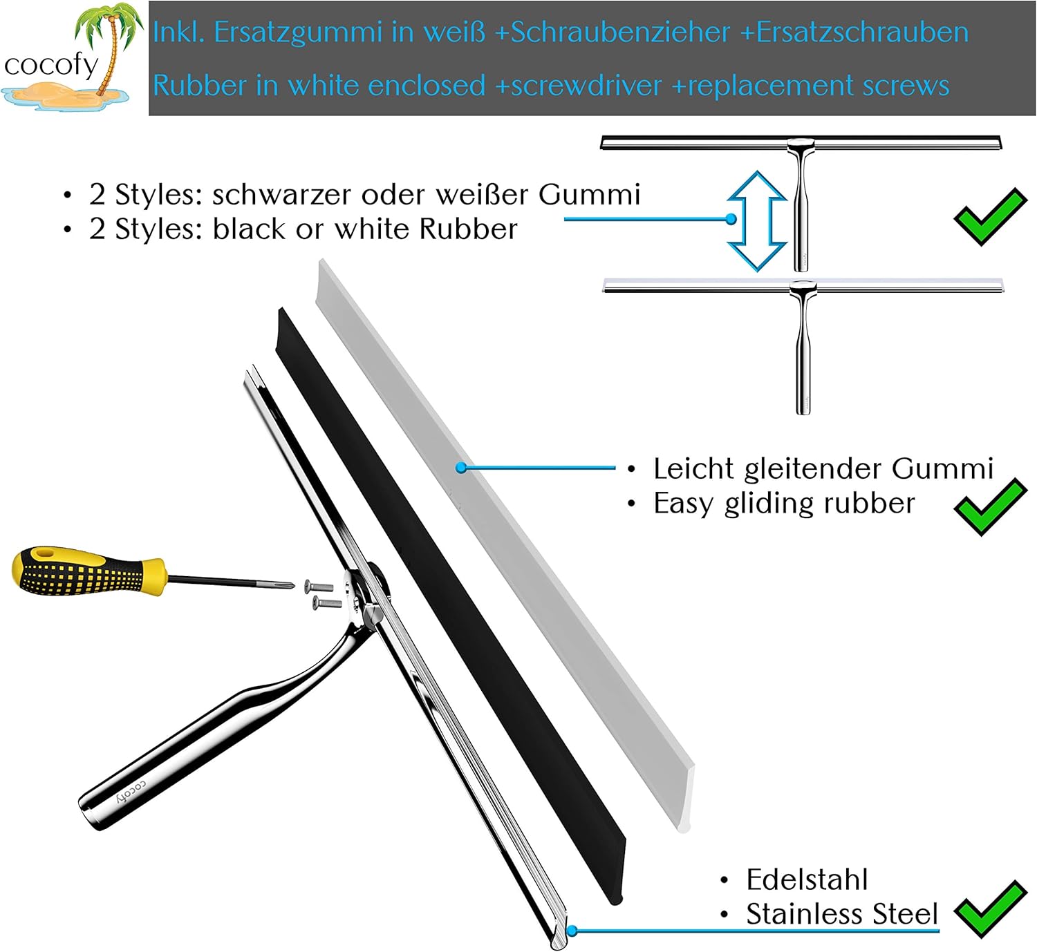 - ✅ ↔ 2 LOOKS DURCH ERSATZ-GUMMILIPPE – Der einzigartige Wasserabzieher für die Dusche oder für Fenster hat einen vormontierten schwarzen Gummi. Der beiliegende Ersatzgummi ist weiss, somit können Sie im Handumdrehen einen zweiten Look erzeugen.