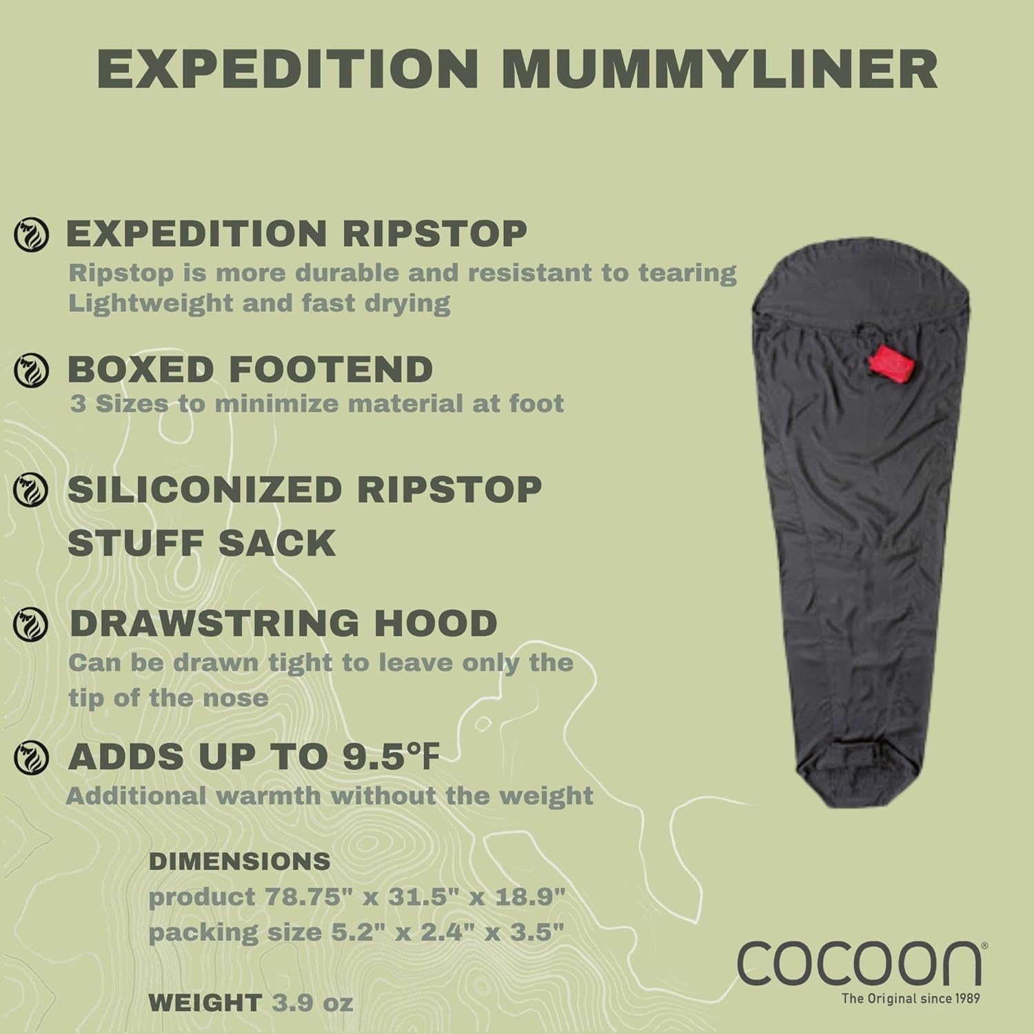 PRODUKTBESCHREIBUNGEN Expedition Liner - Innenschlafsack für Expeditionen mit wasserdichtem Packsack, umlaufendem, elastischem Schnürzug für die Kapuze und anderen speziellen, funktionellen Details Für Alpinisten, Extrembergsteiger und Expeditionsteilnehmer hat Cocoon einen auf minimalstes Gewicht und Packmass, schnellste Trocknung sowie höchste Funktionalität optimierten Innenschlafsack entwickelt. Der Cocoon Expedition Liner Höchste Seidenqualität ist für uns eine Selbstverständlichkeit. Die extrem leichten, handlichen MummyLiners aus Ripstop Seide sind sehr weich, hautfreundlich und temperaturausgleichend: sie kühlen bei heissem Wetter und wärmen bei Kälte. MummyLiners aus Ripstop Seide sind leicht zu waschen und trocknen extrem schnell. Ein MummyLiner ist ein extrem leichter mumienförmiger Innenschlafsack zum Schutz des Schlafsackes vor Verschmutzung und zur Erhöhung seiner Wärmeleistung. Cocoon Seidenschlafsack Expedition Liner Small + 5,3 - Silk Ripstop Stapazierfähiger Seid