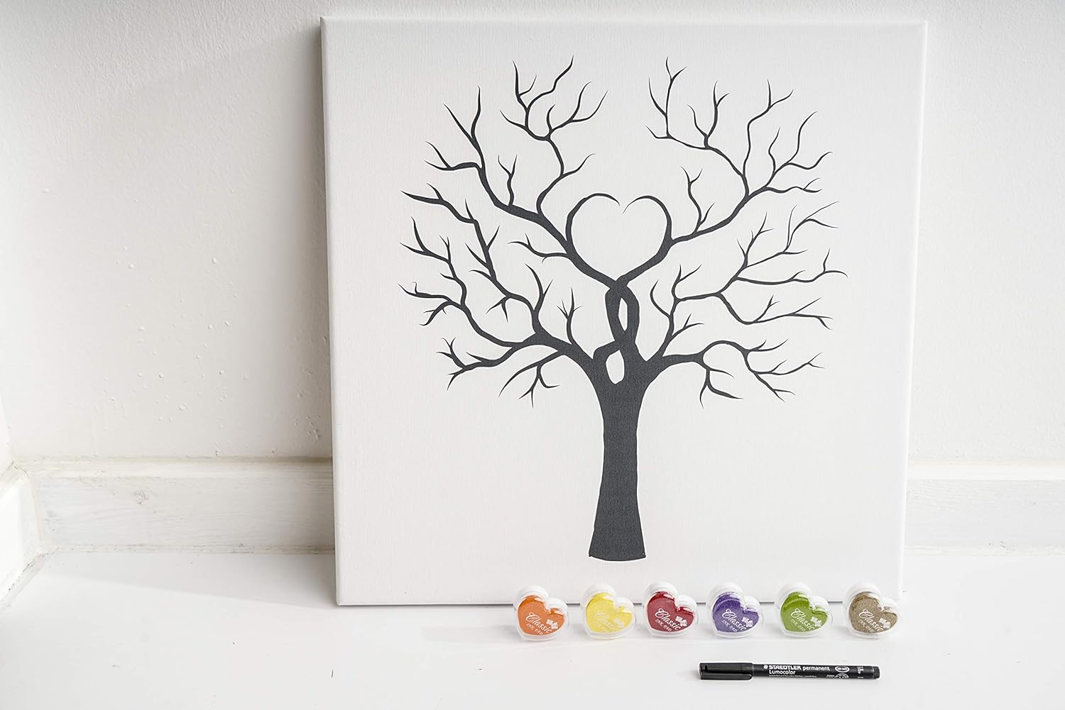 - LIEFERUMFANG 1 Leinwand für Fingerabdrücke auf Echt-Holz-Keilrahmen gespannt (Format 50x50 cm gross), Made in Germany / EU, 1 Set mit 6 Stempelkissen in Herzform (Farben gold, gelb, rot, grün, lila, blau, rosa, orange [Auswahl kann variieren!] jedes Stempelkissen ist separat eingeschweisst und damit sicher gegen Austrocknung!, 1 schwarz schreibender Stift (Faser-Stift speziell für Leinwandbilder - Testsieger aus 10 weiteren von uns getesteten Stiften) keine Lagerware, immer frisch vom Hersteller