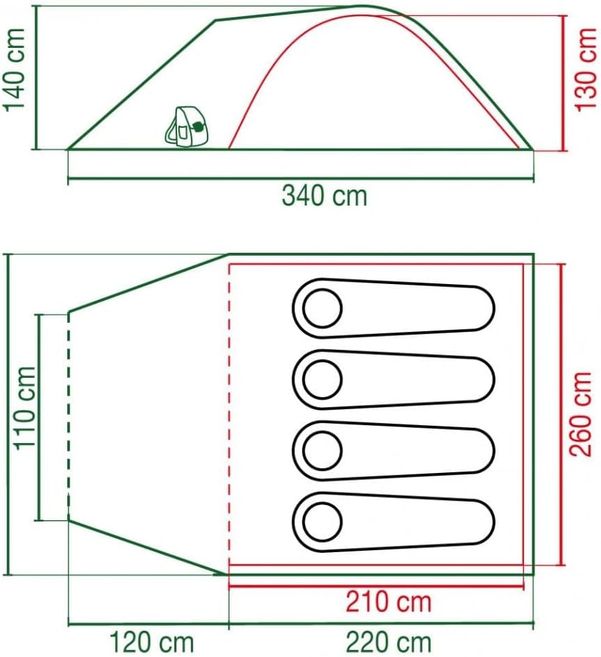 - Mit Moskitonetz und Belüftungsschlitzen im Schlafbereich. Ferner sind im Lieferumfang Abspannleinen, Heringe für Grasboden sowie eine Transporttasche enthalten