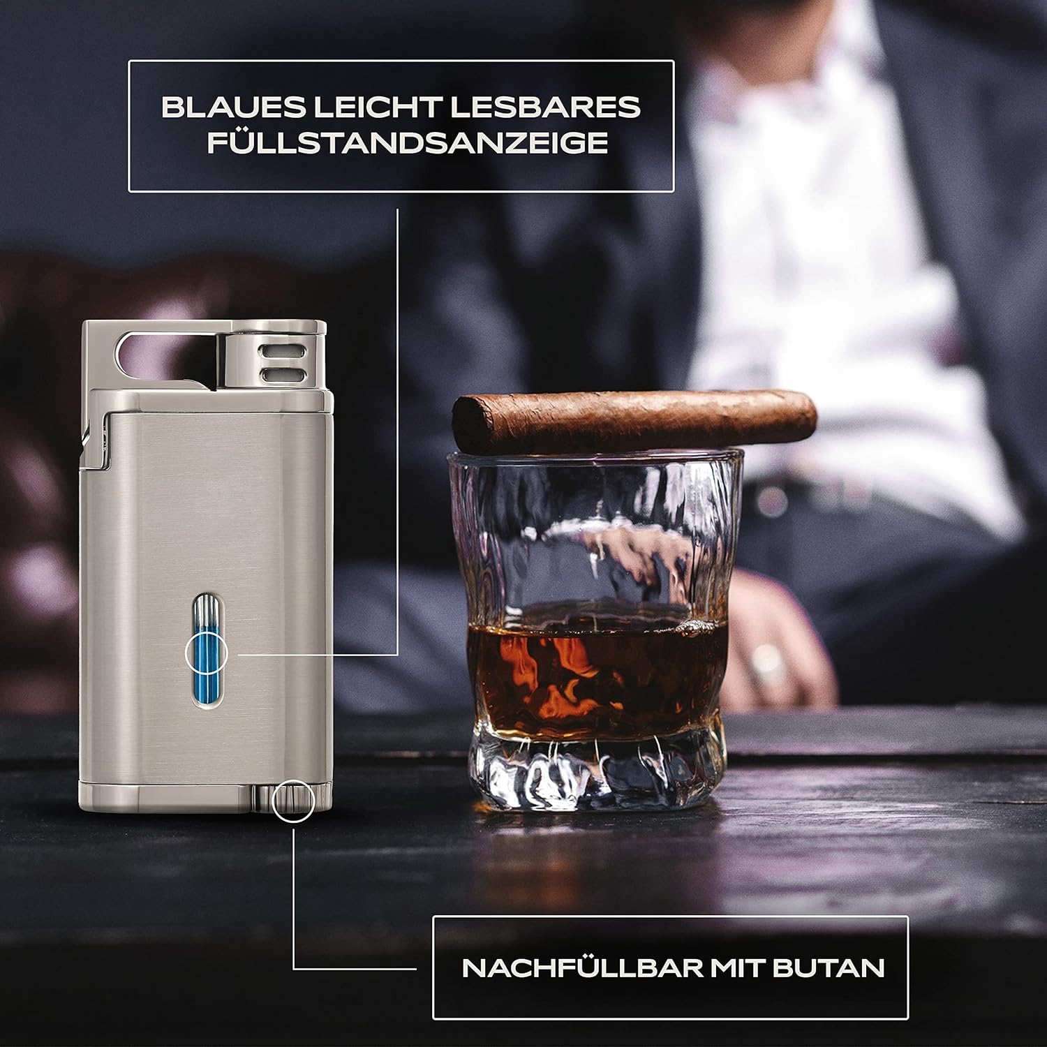 • Das grosse Einstellrad für den Brennstoff ermöglicht eine einfache Einstellung der Flamme und sorgt für die perfekte Flamme für Ihre Zigarre oder Zigarette.