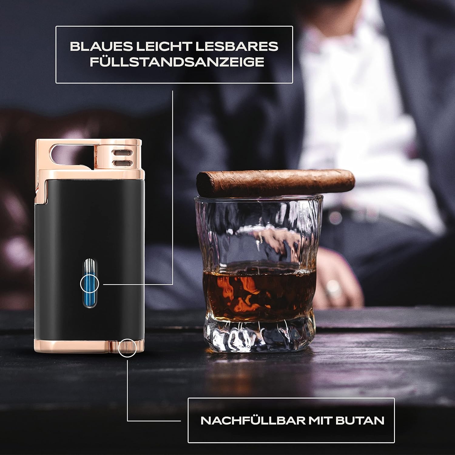 • Das grosse Einstellrad für den Brennstoff ermöglicht eine einfache Einstellung der Flamme und sorgt für die perfekte Flamme für Ihre Zigarre oder Zigarette.